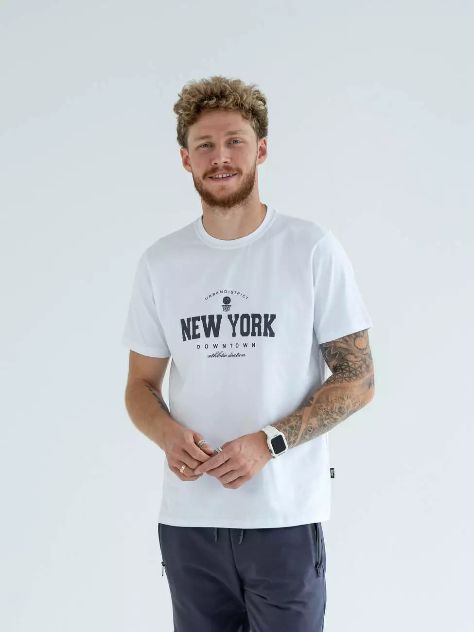 Мужская базовая футболка прямого кроя с принтом. Эластичный