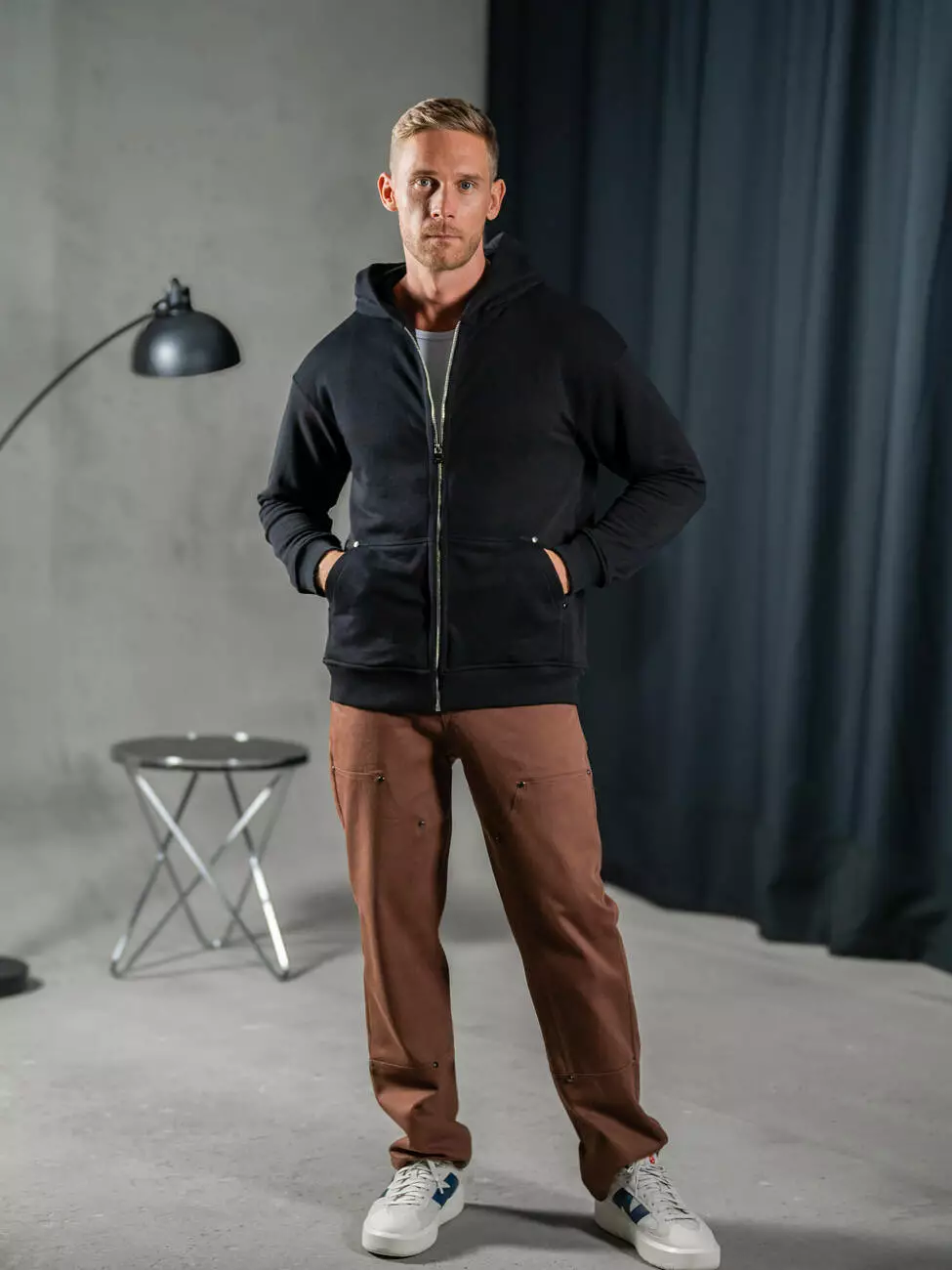 Мужская однотонная толстовка на молнии свободного кроя с эластичным