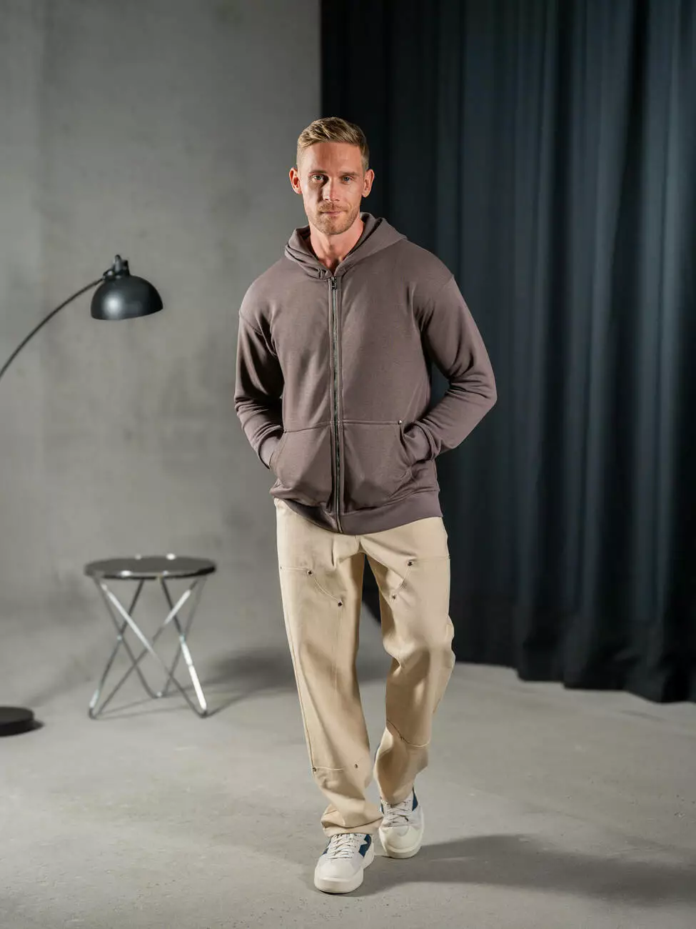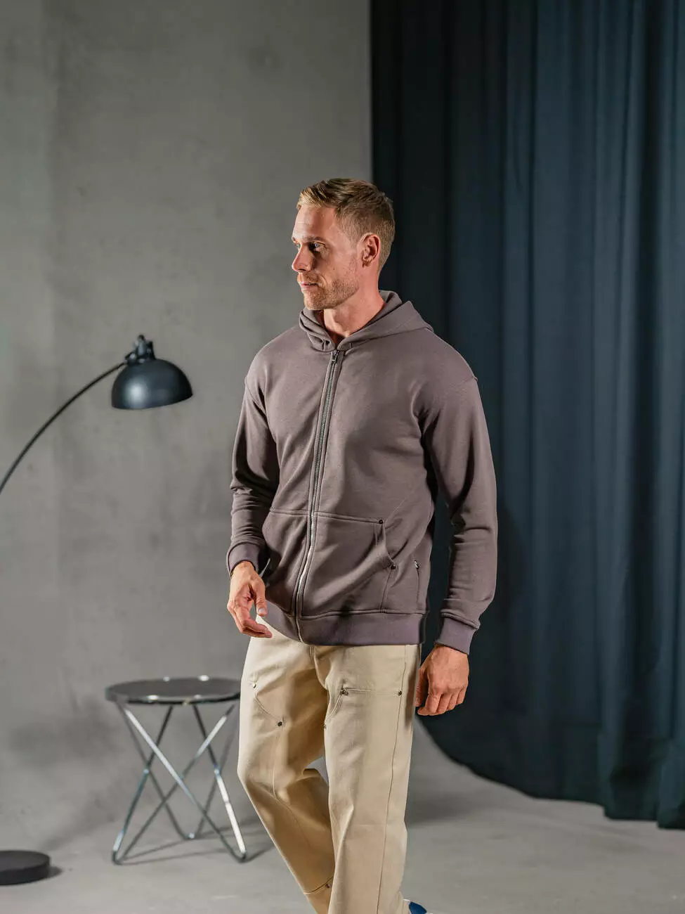 Мужская однотонная толстовка на молнии свободного кроя с эластичным