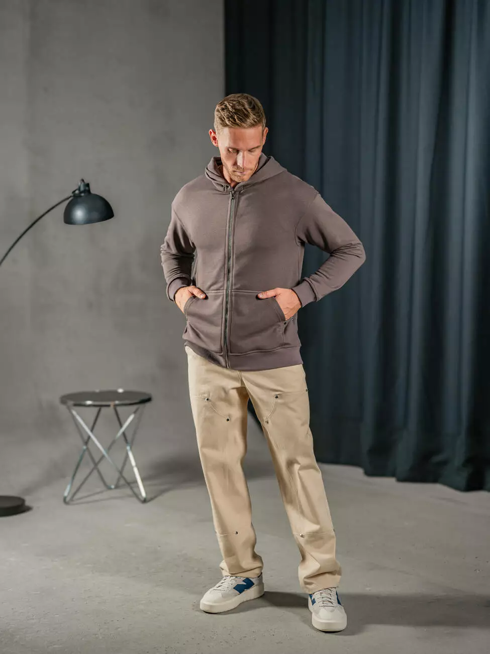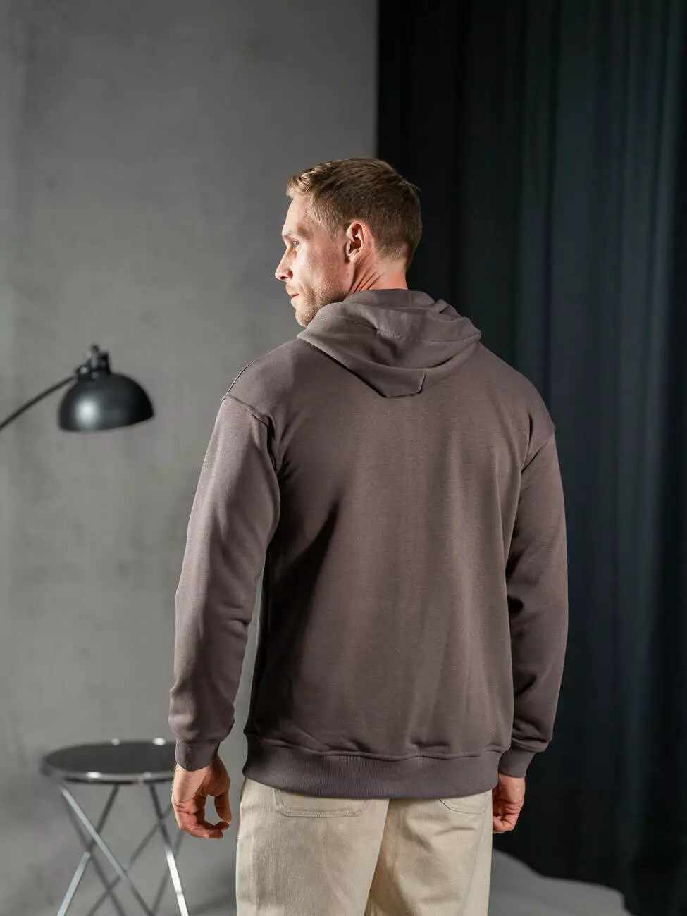 Мужская однотонная толстовка на молнии свободного кроя с эластичным
