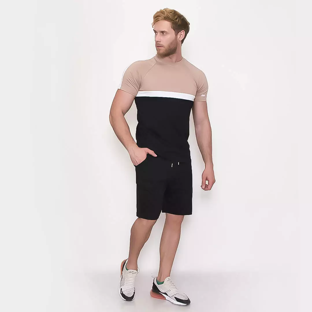 Костюм с контрастными элементами на футболке и однотонными шортами.