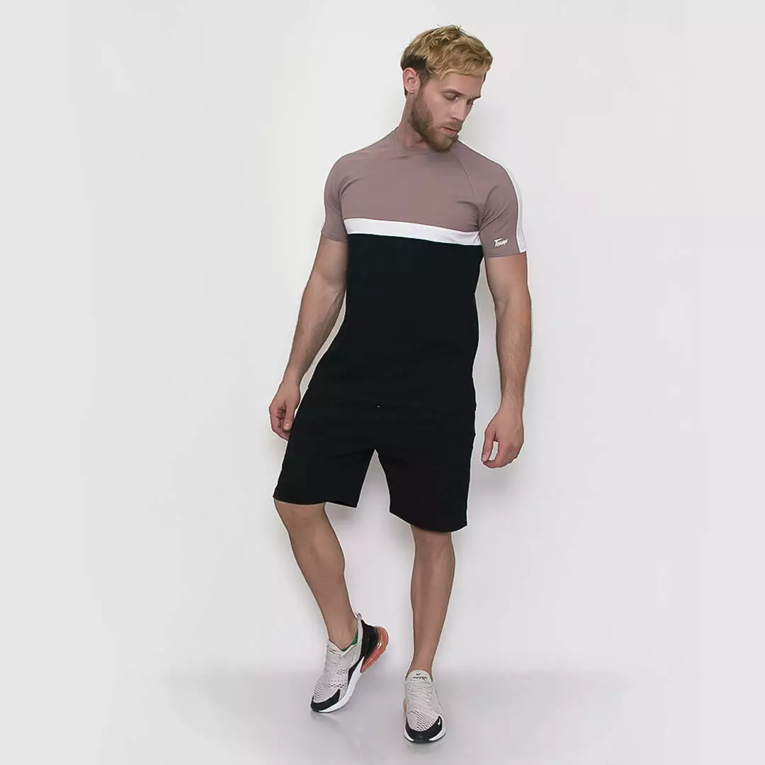 Костюм с контрастными элементами на футболке и однотонными шортами.