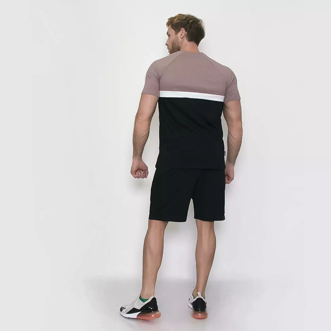 Костюм с контрастными элементами на футболке и однотонными шортами.