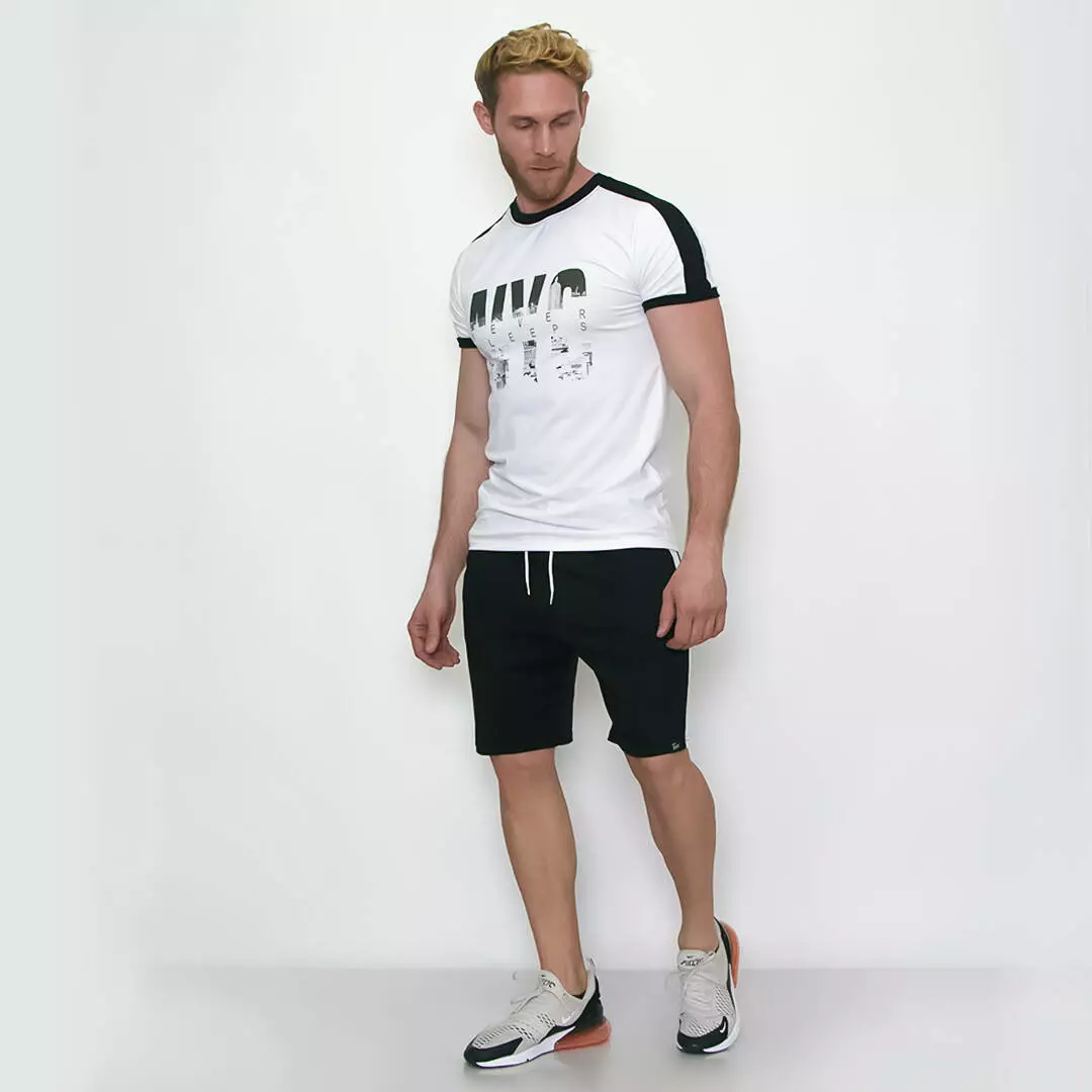 Костюм из шорт и футболки с контрастными лампасами и графическим