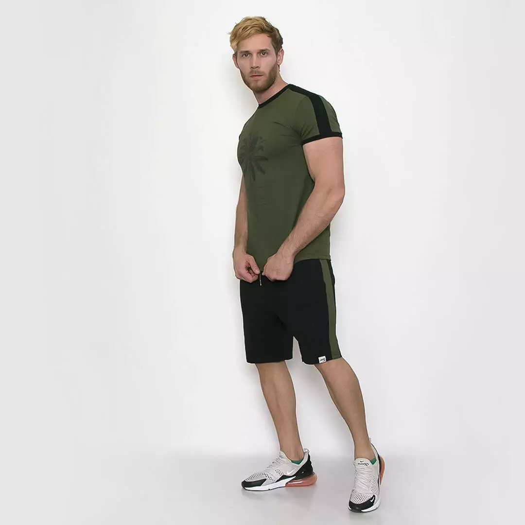 Костюм из шорт и футболки с контрастными лампасами и графическим