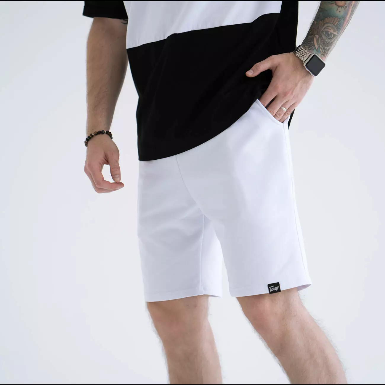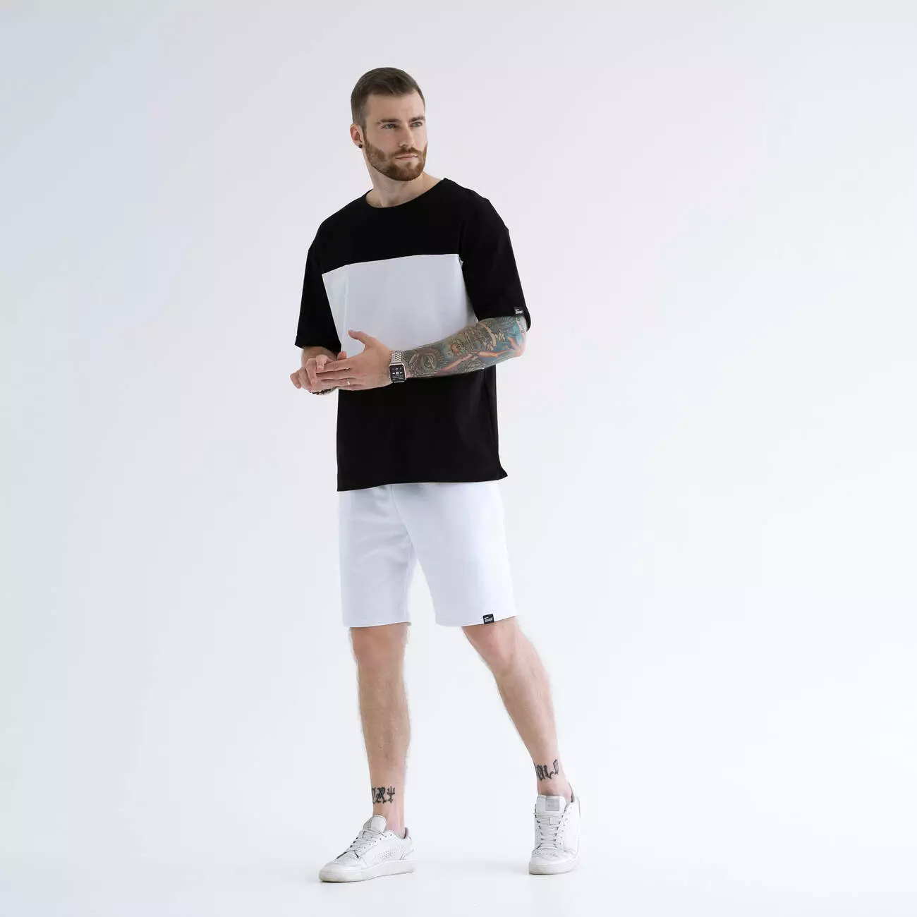Костюм из шорт и футболки с контрастной вставкой. Легкий материал