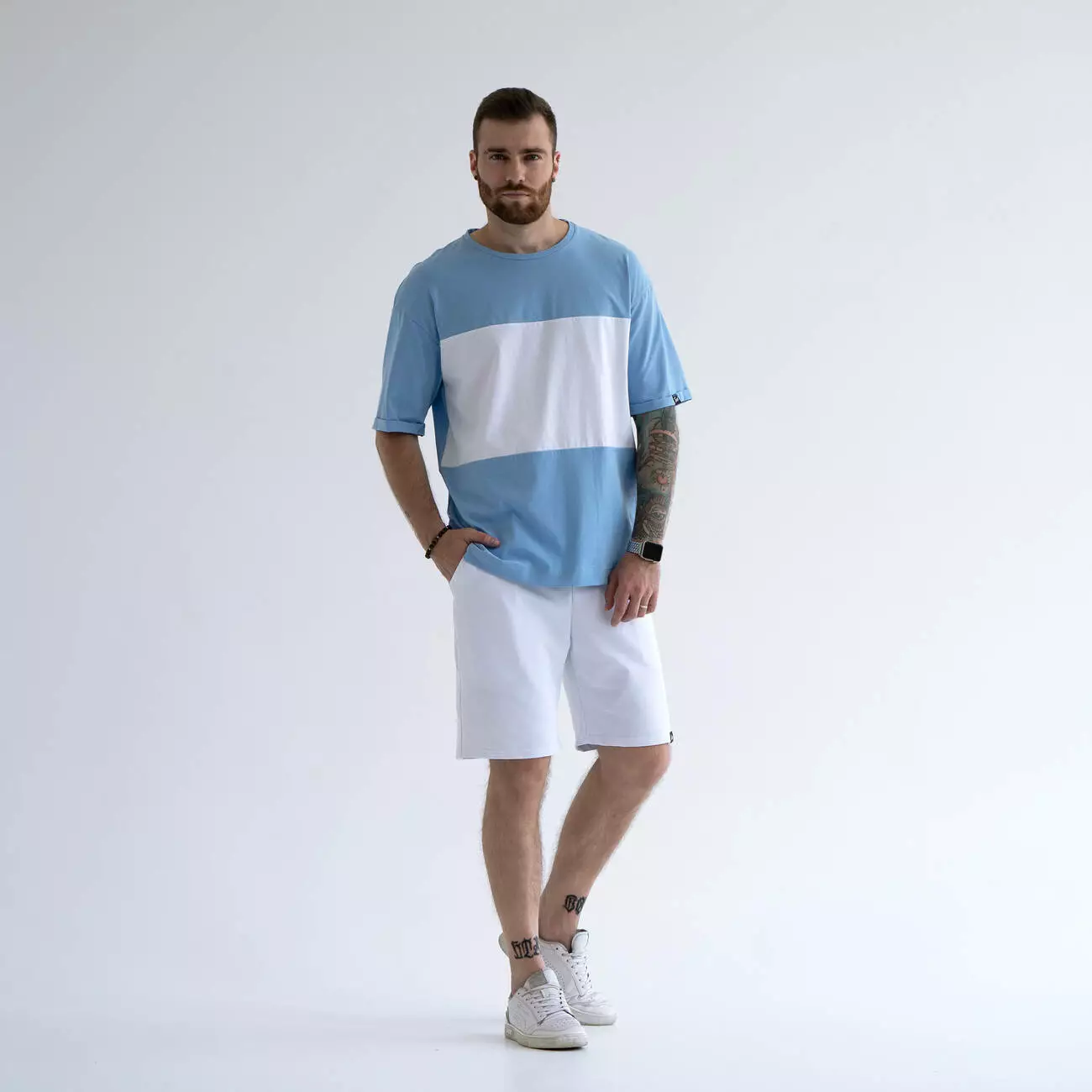 Костюм из шорт и футболки с контрастной вставкой. Легкий материал