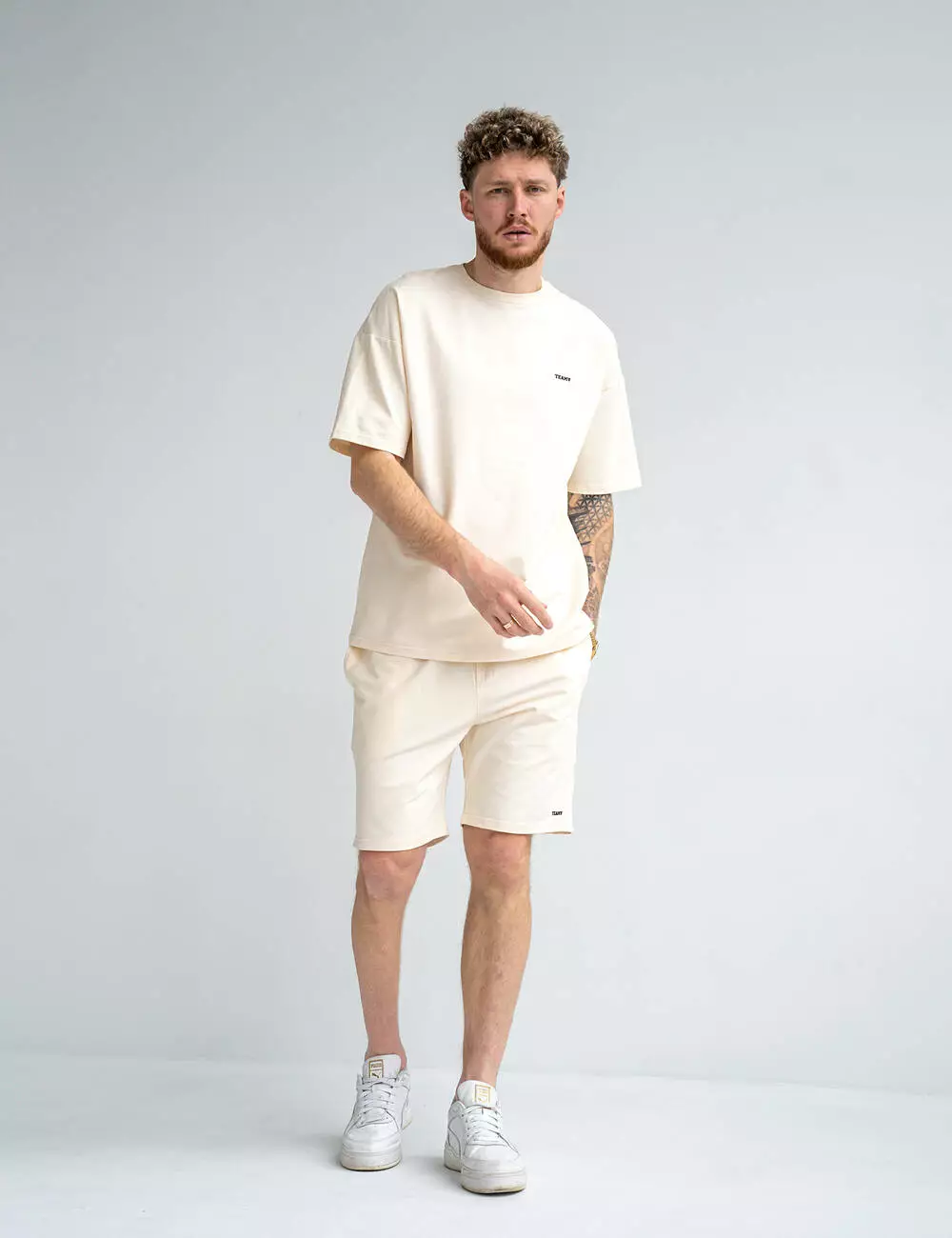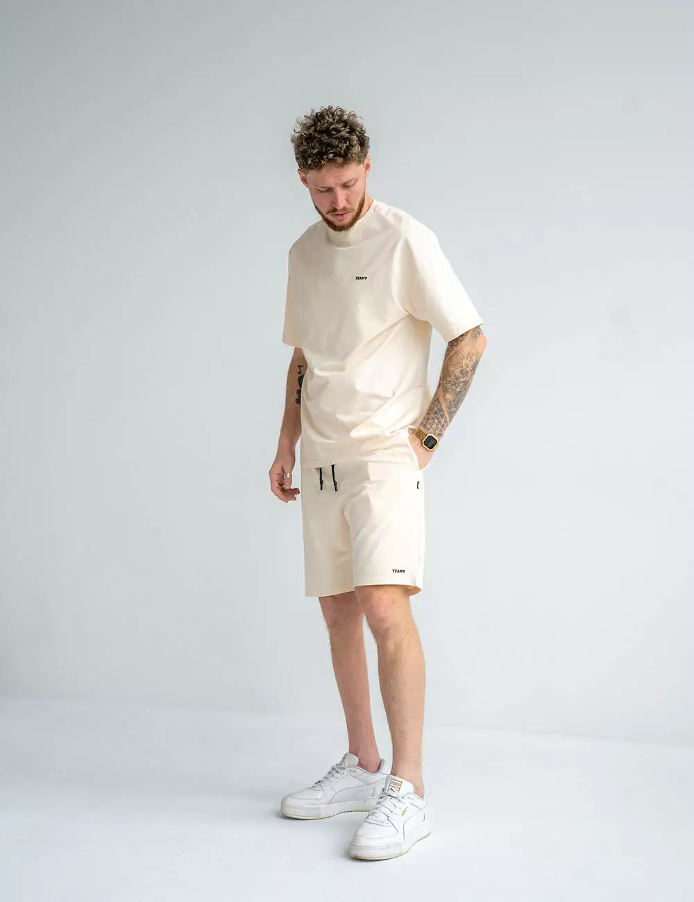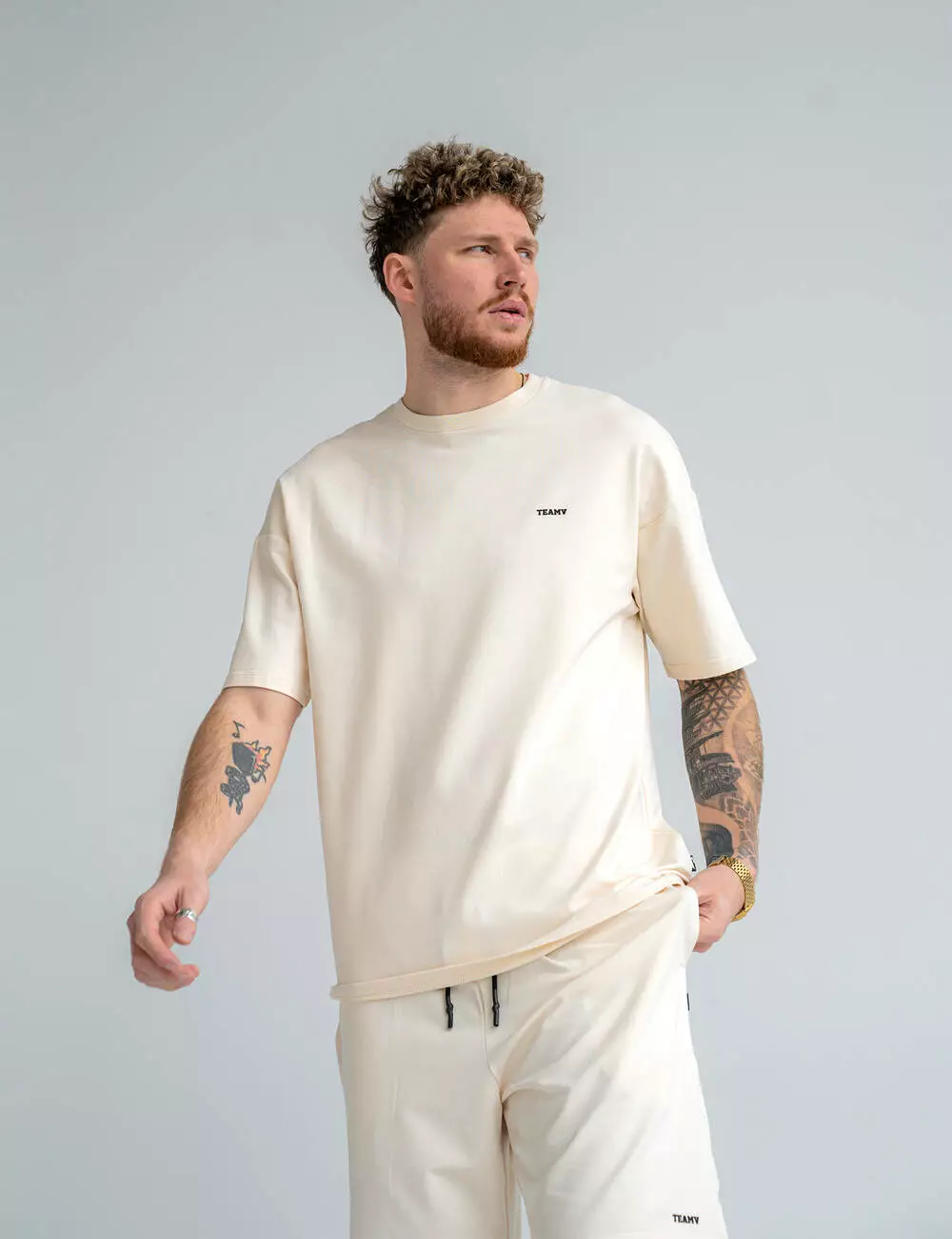 футболка с логотипом TEAMV и свободными шортами с эластичным поясом