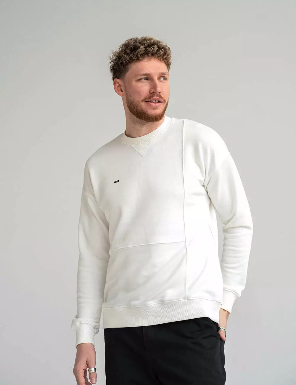 Дизайн свитшота со спущенными плечами и рельефными швами. Манжеты и