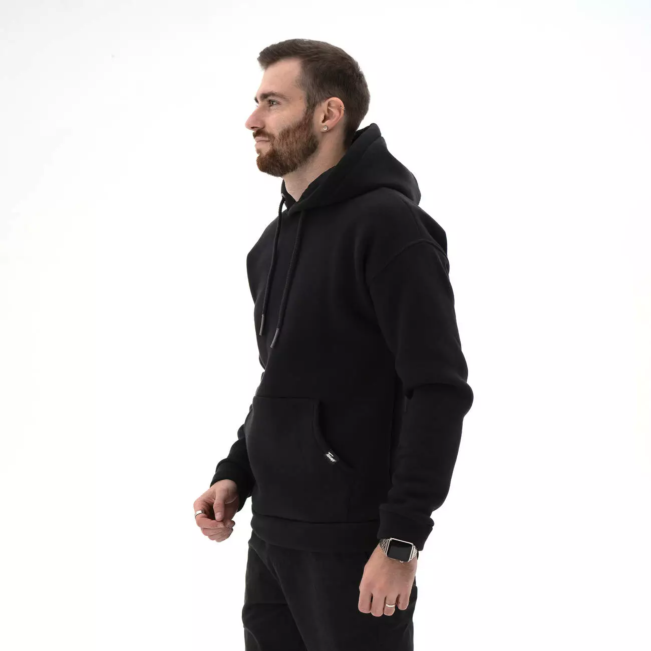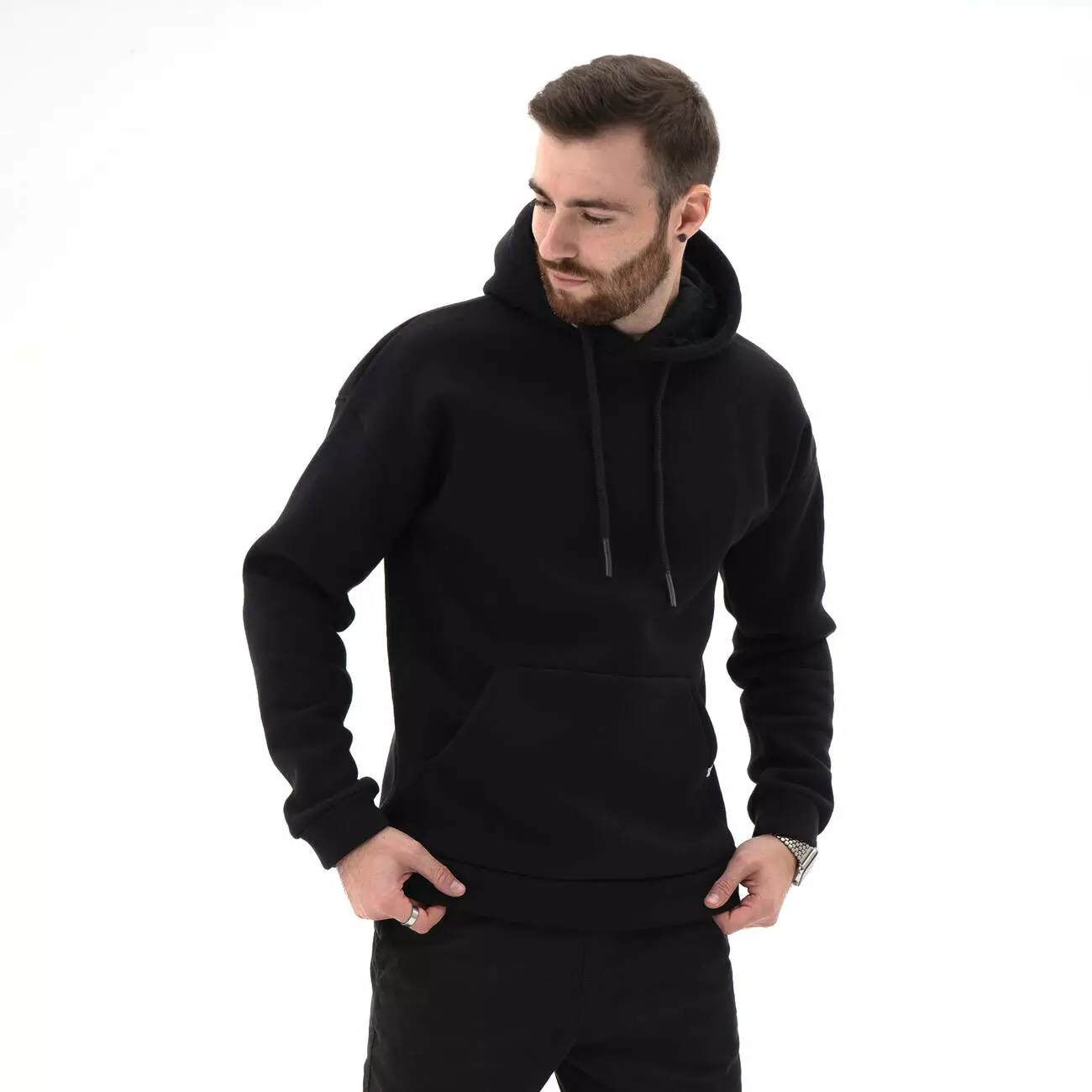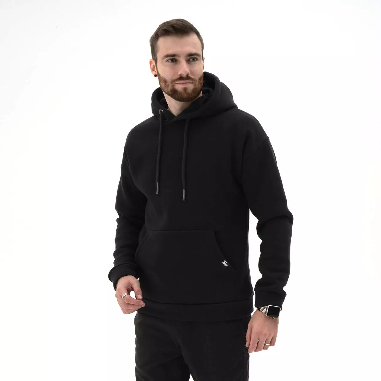Мужской теплый базовый худи больших размеров со спущенным плечом. Комфортный однотонный худи с карманом-кенгуру.