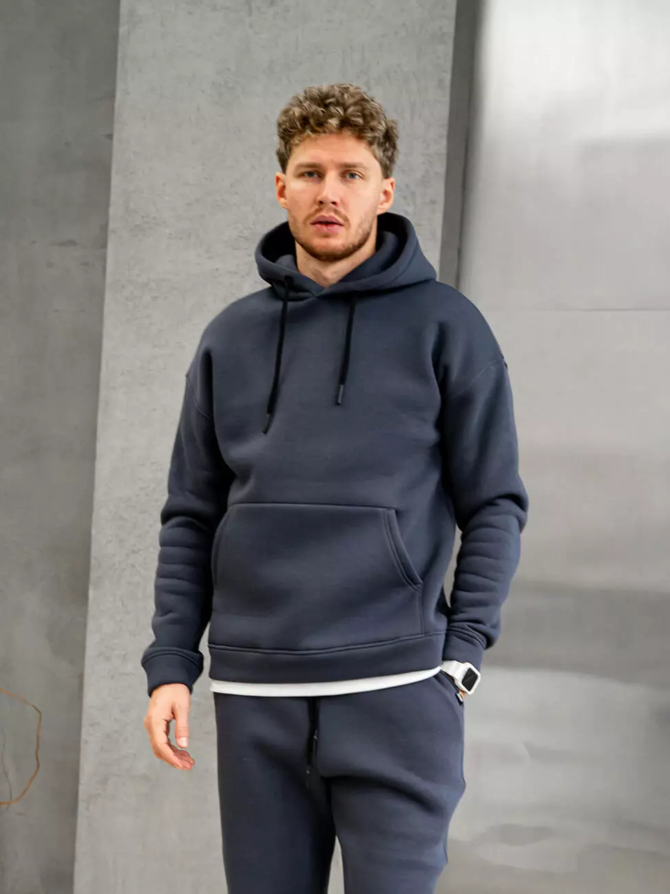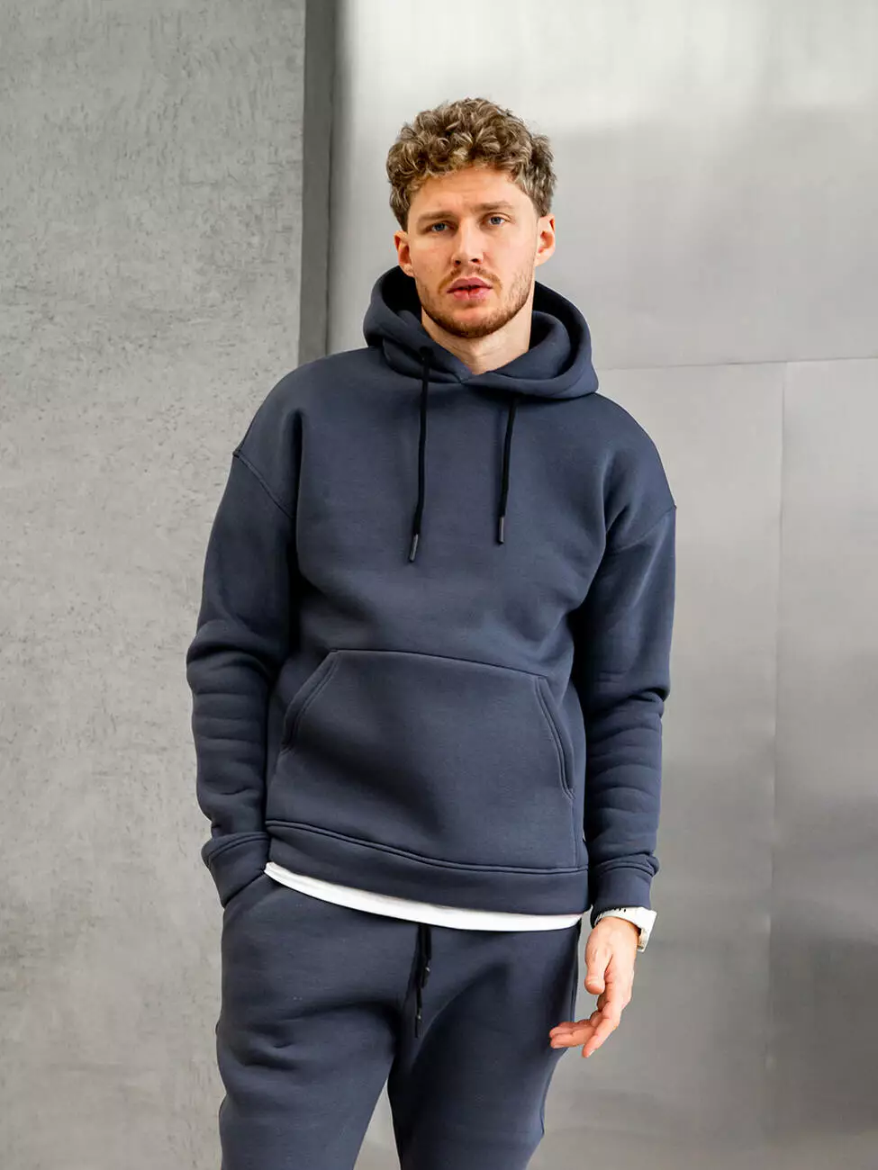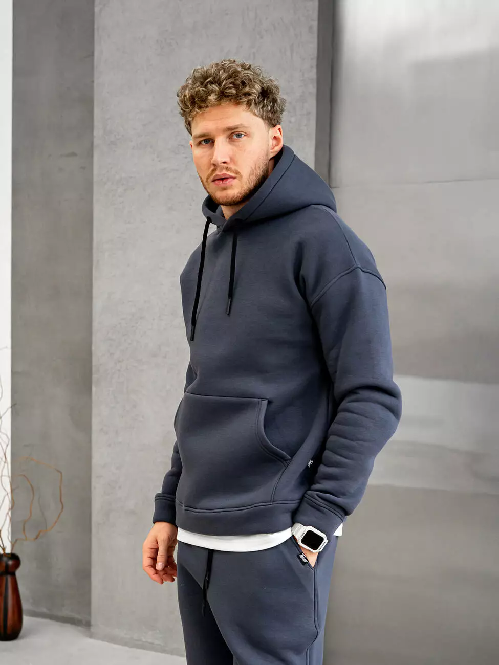 Мужской теплый базовый худи больших размеров со спущенным плечом. Комфортный однотонный худи с карманом-кенгуру.