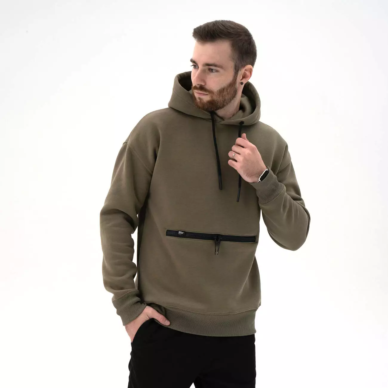 Мужской теплый худи с глубоким карманом на змейке и капюшоном.