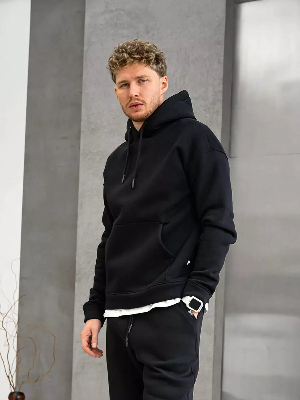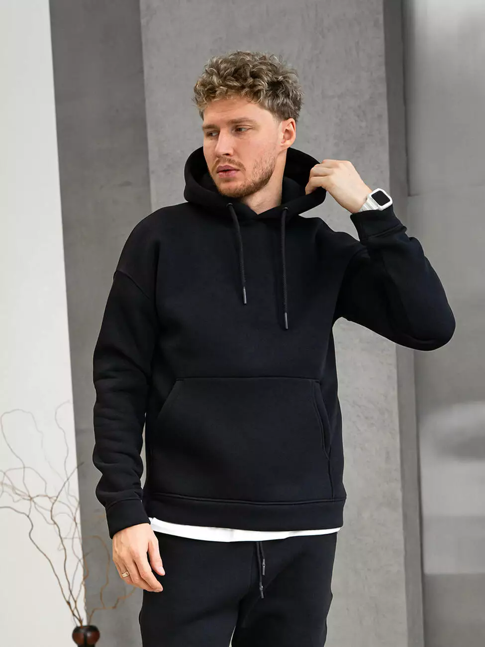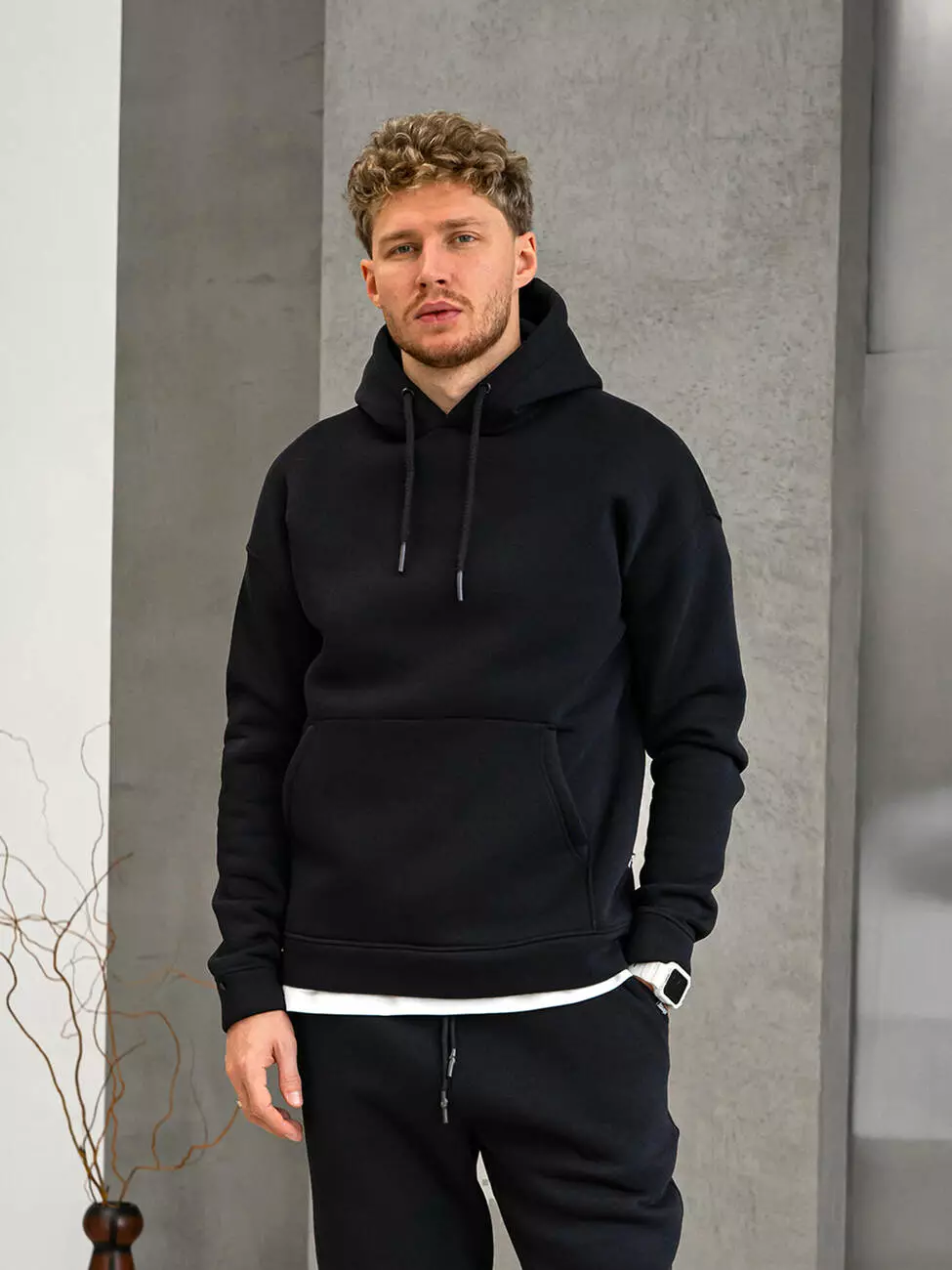 Мужской теплый базовый худи со спущенным плечом. Комфортный однотонный худи с карманом-кенгуру.