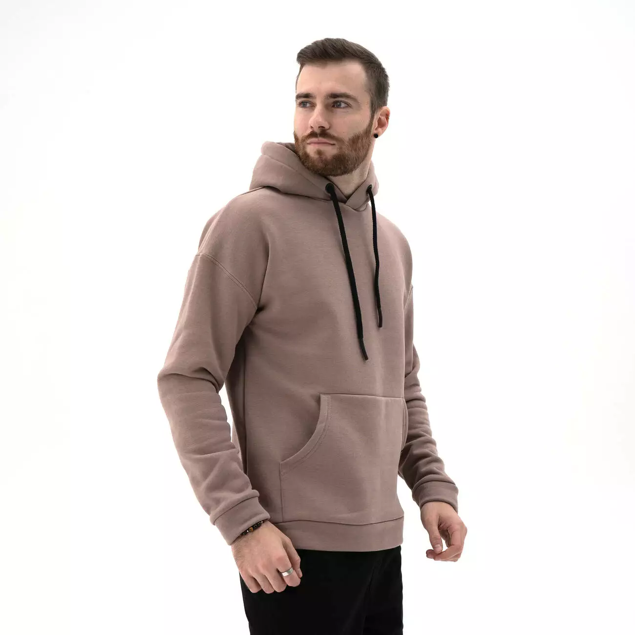 Мужской теплый базовый худи со спущенным плечом. Комфортный однотонный худи с карманом-кенгуру.