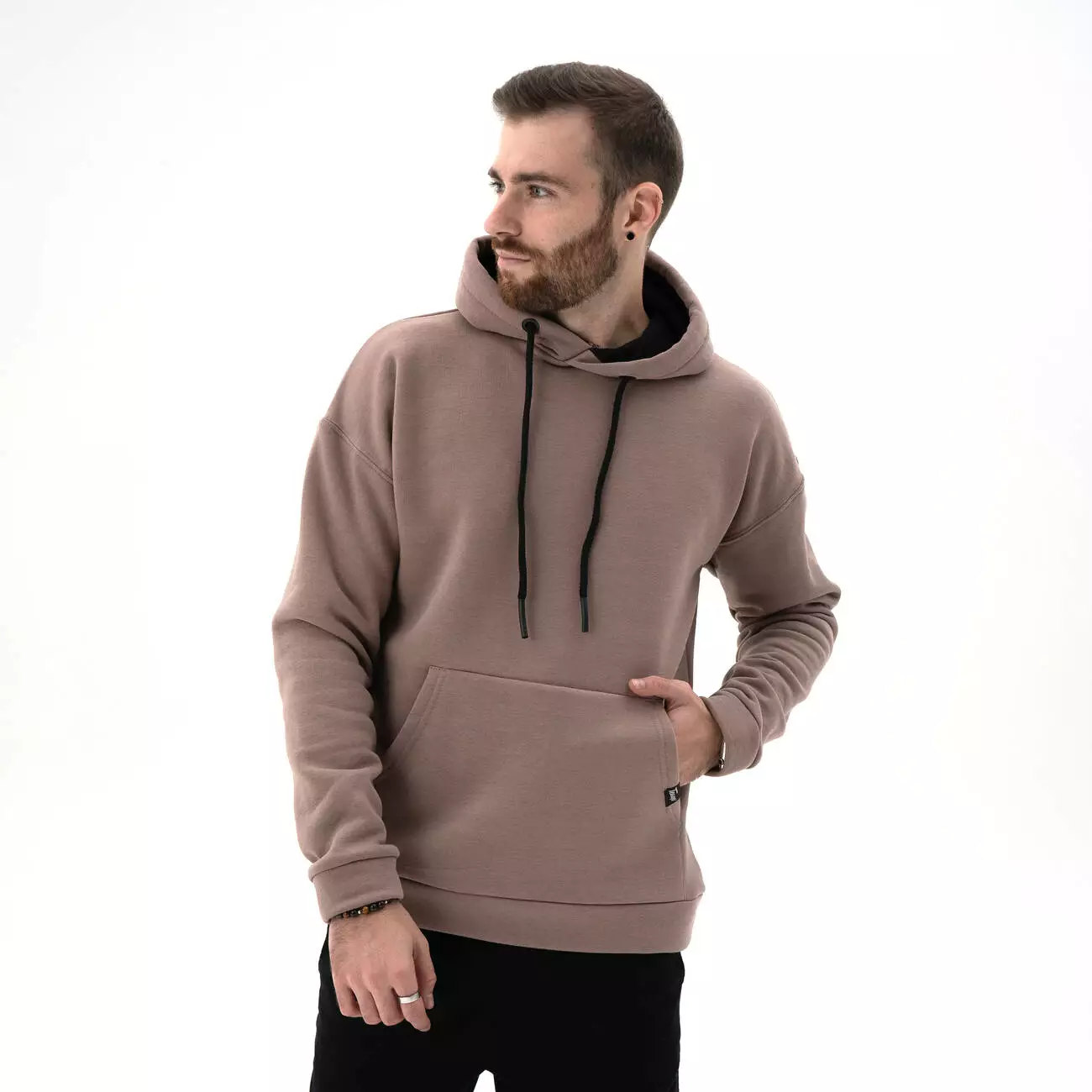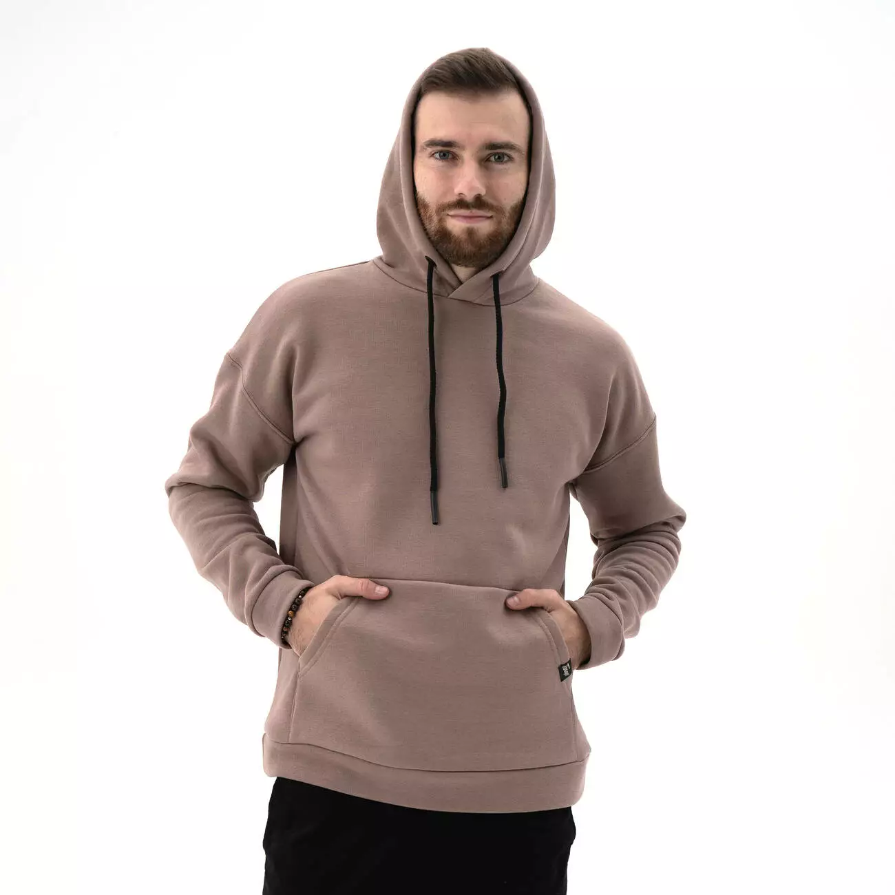 Мужской теплый базовый худи со спущенным плечом. Комфортный однотонный худи с карманом-кенгуру.
