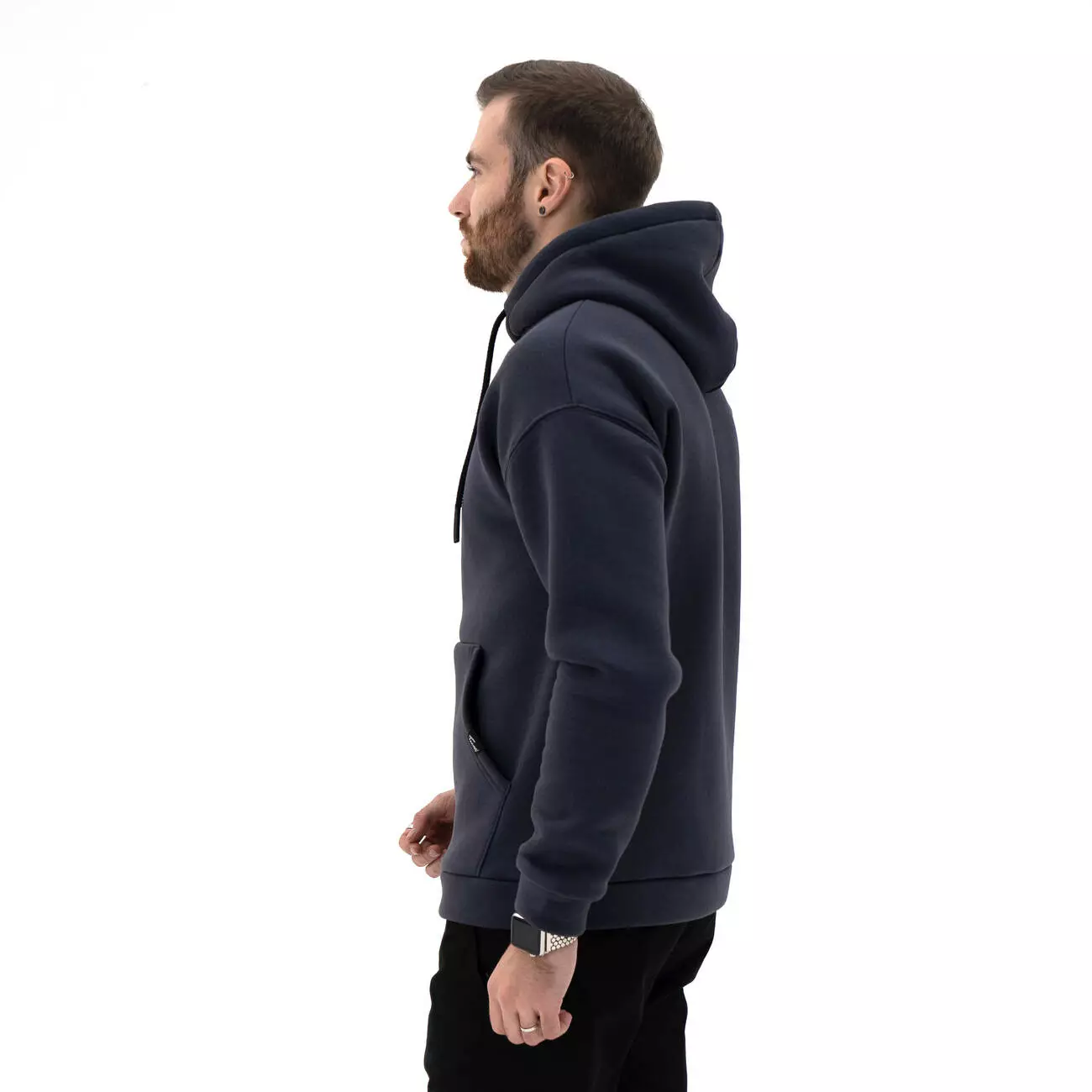 Мужской теплый базовый худи со спущенным плечом. Комфортный однотонный худи с карманом-кенгуру.