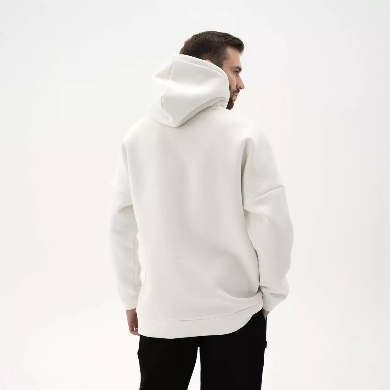 Худи со спущенным плечом, объемным капюшоном и карманом-кенгуру.