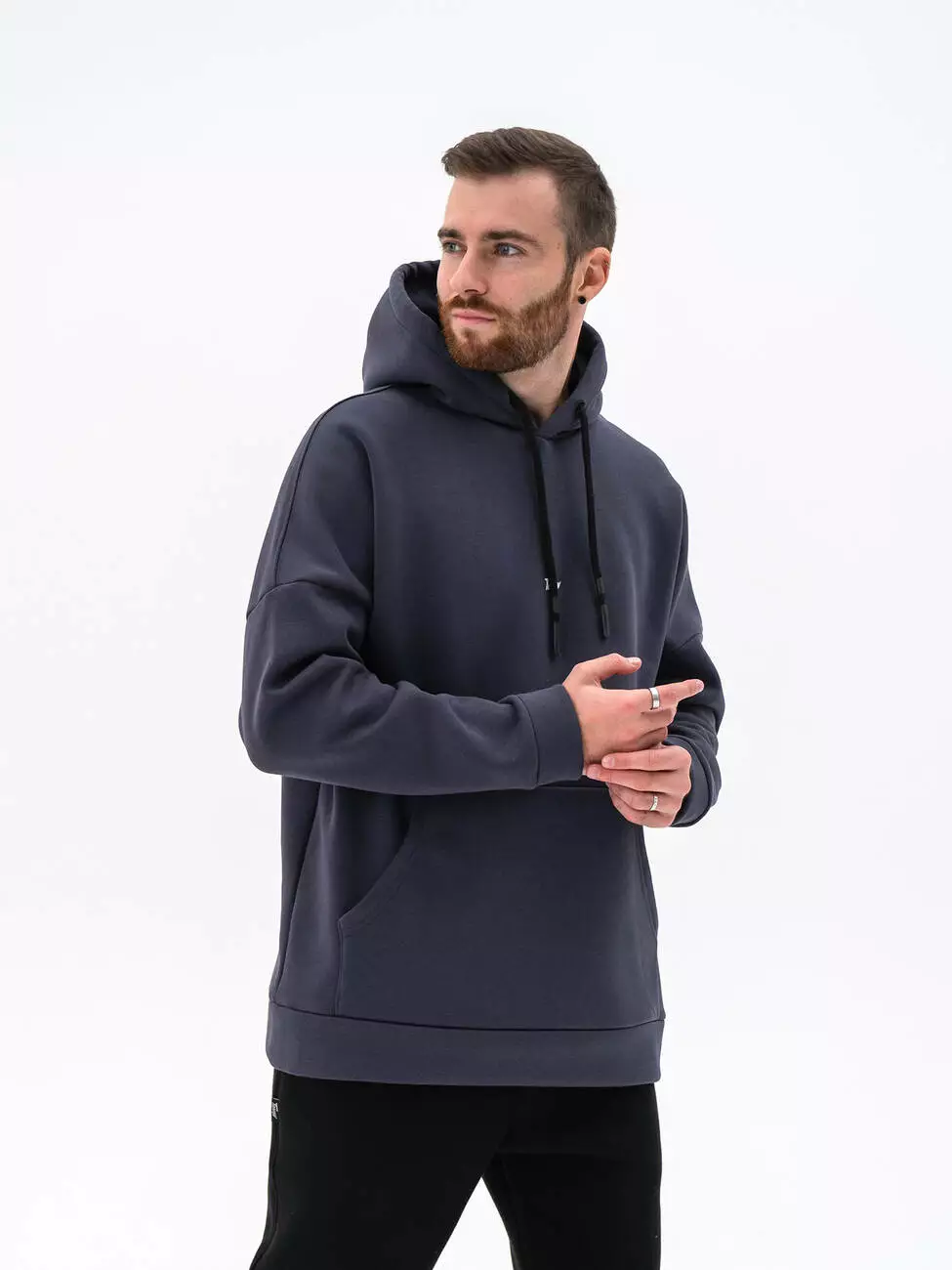 Худи со спущенным плечом, объемным капюшоном и карманом-кенгуру.