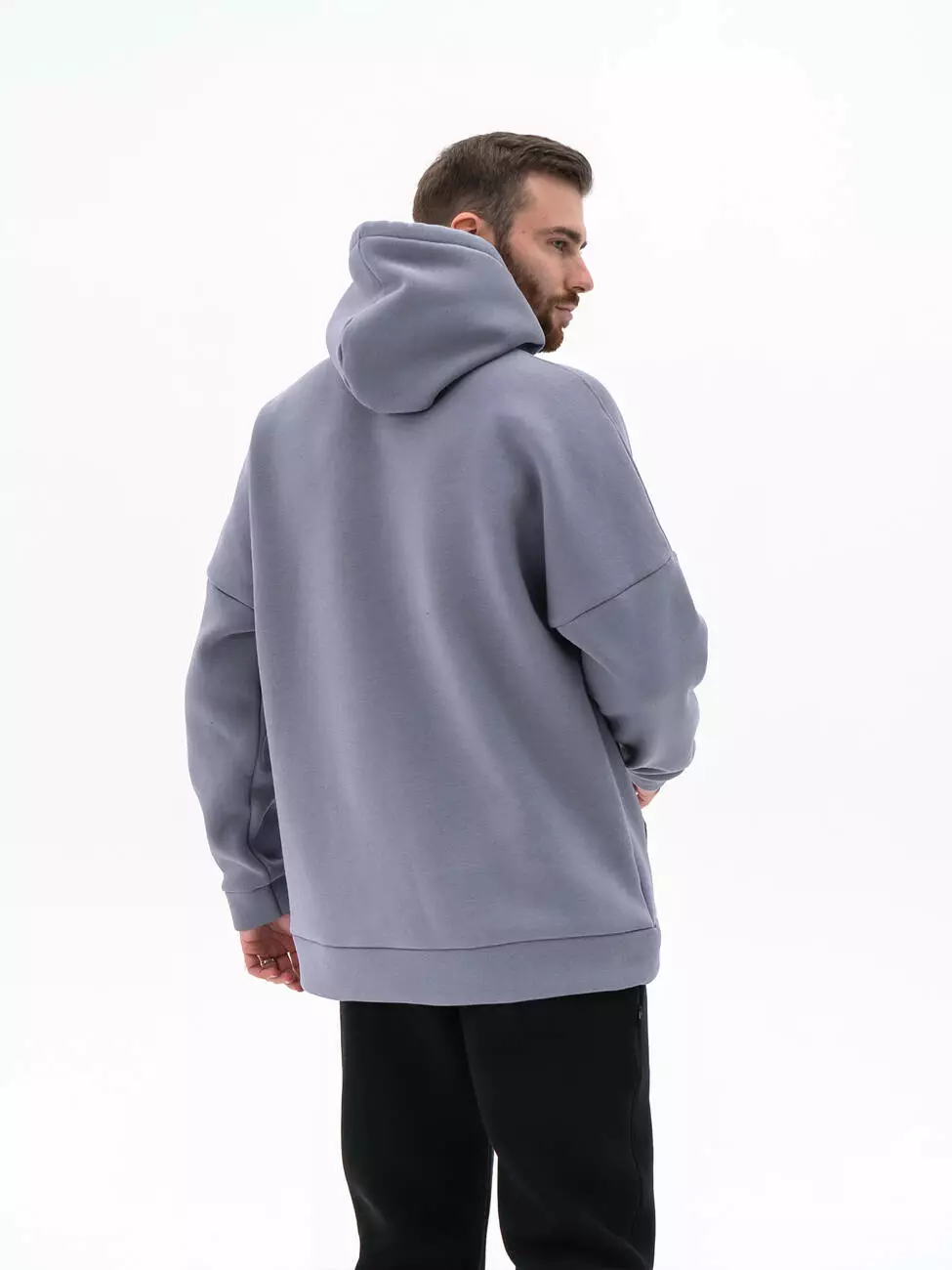 Худи со спущенным плечом, объемным капюшоном и карманом-кенгуру.