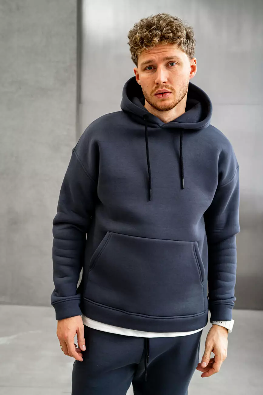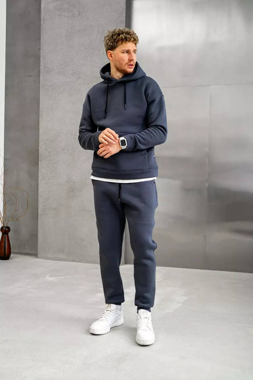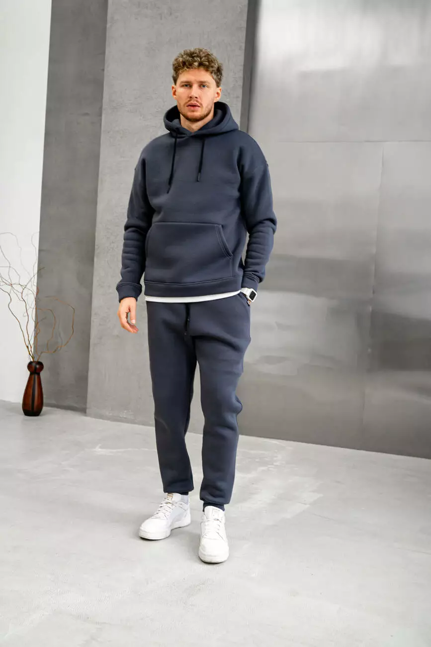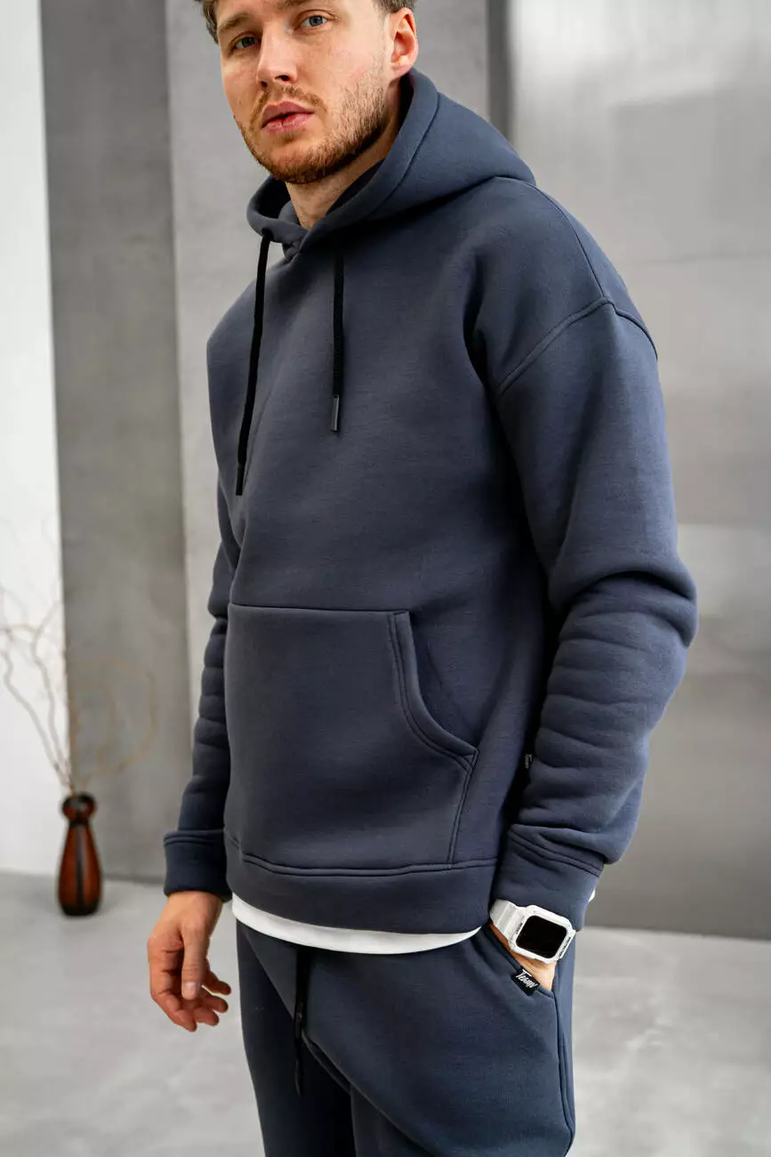 Мужской теплый спортивный однотонный костюм. Худи с капюшоном и