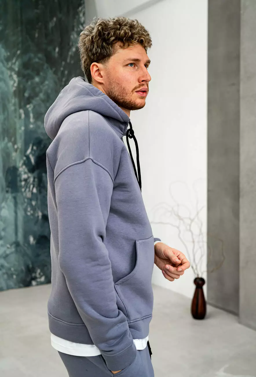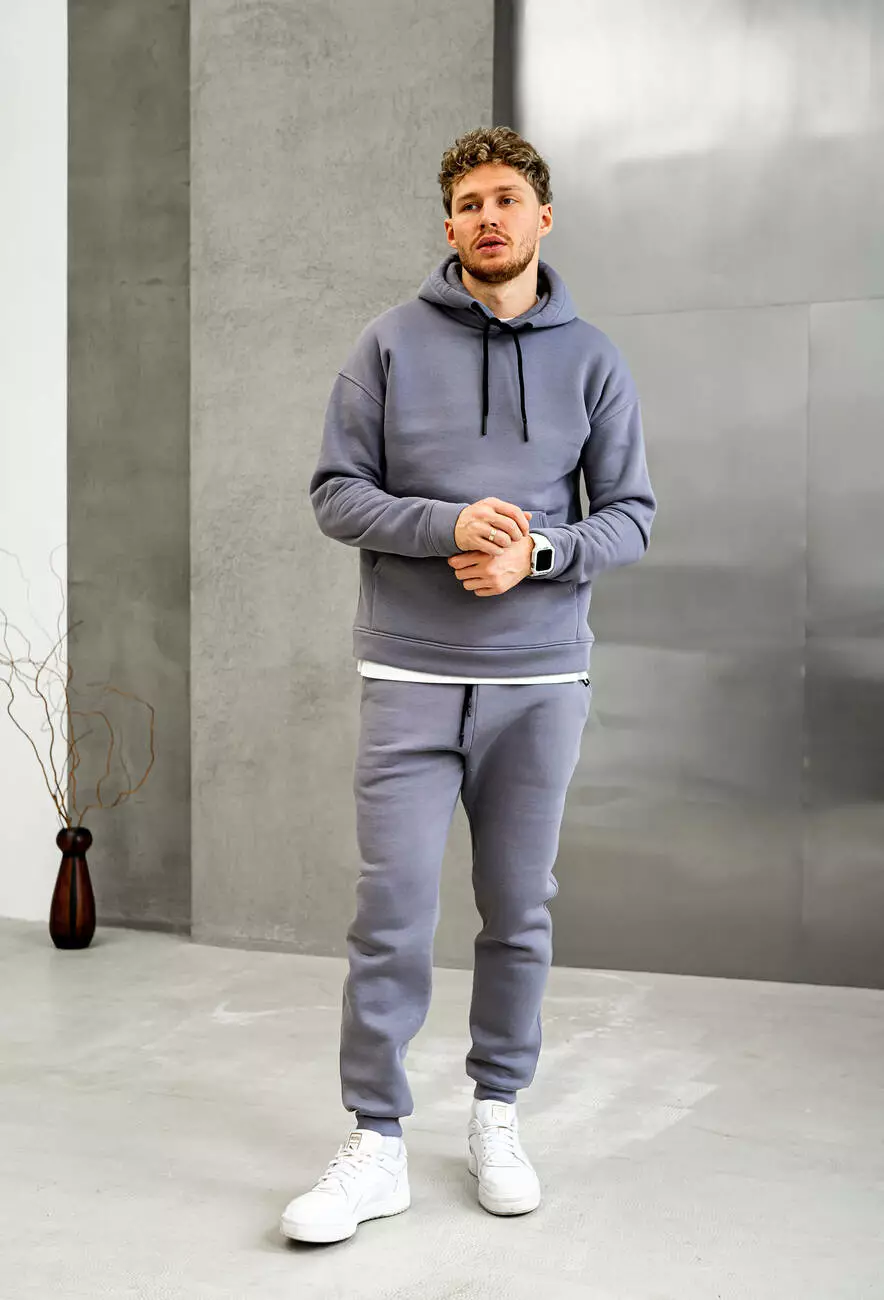 Мужской теплый спортивный однотонный костюм. Худи с капюшоном и