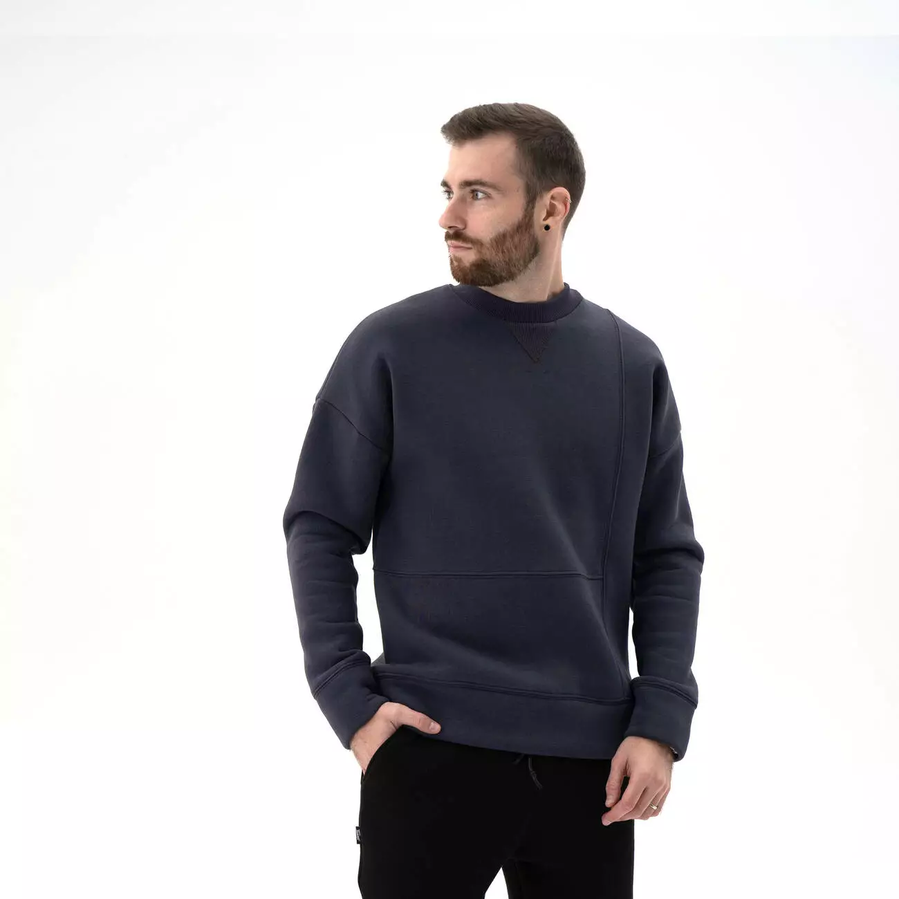Мужской теплый свитшот свободного кроя. Свитшот с отделкой швом флэтлок возле горловины и дополнительными швами спереди.