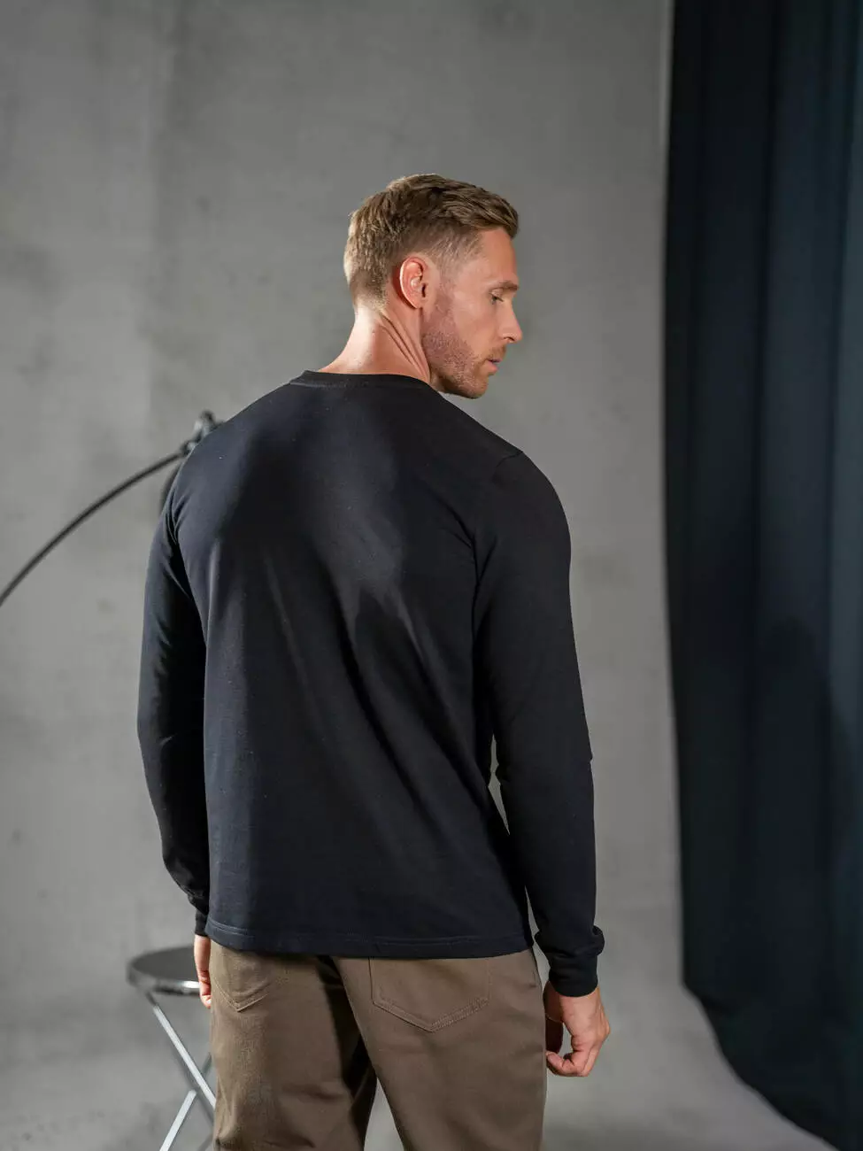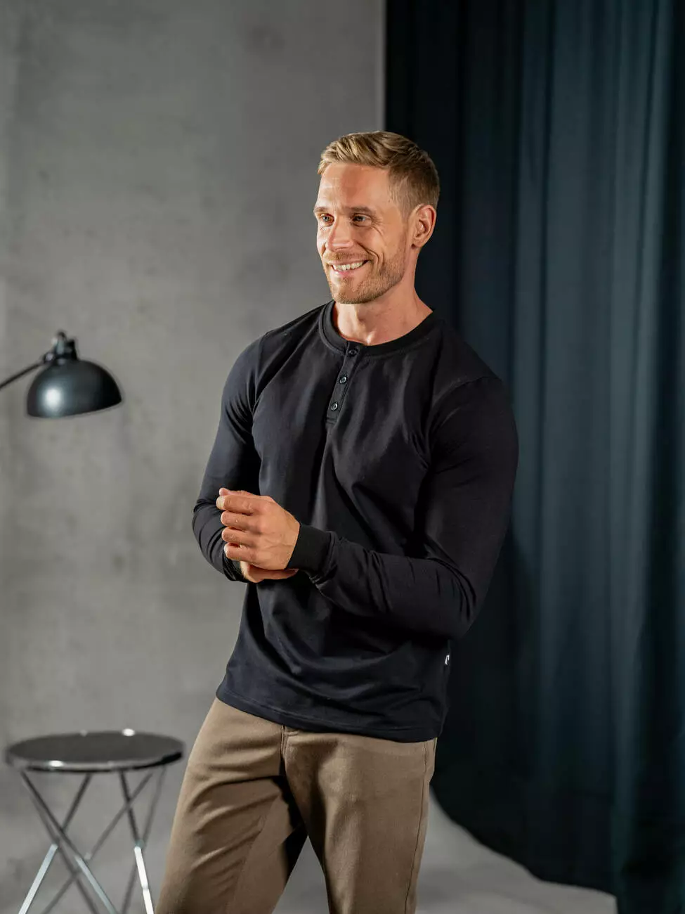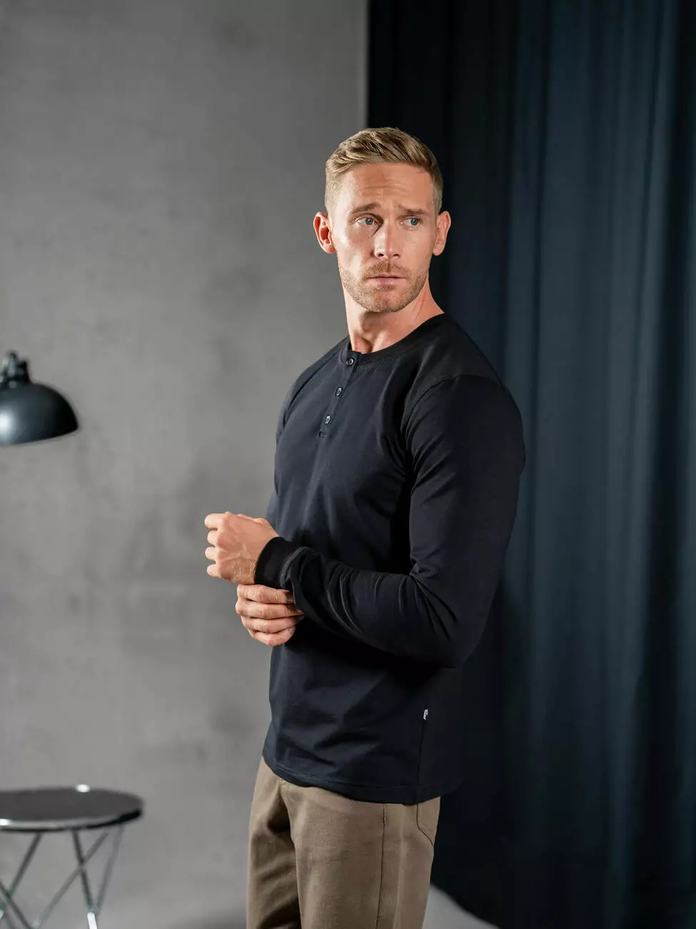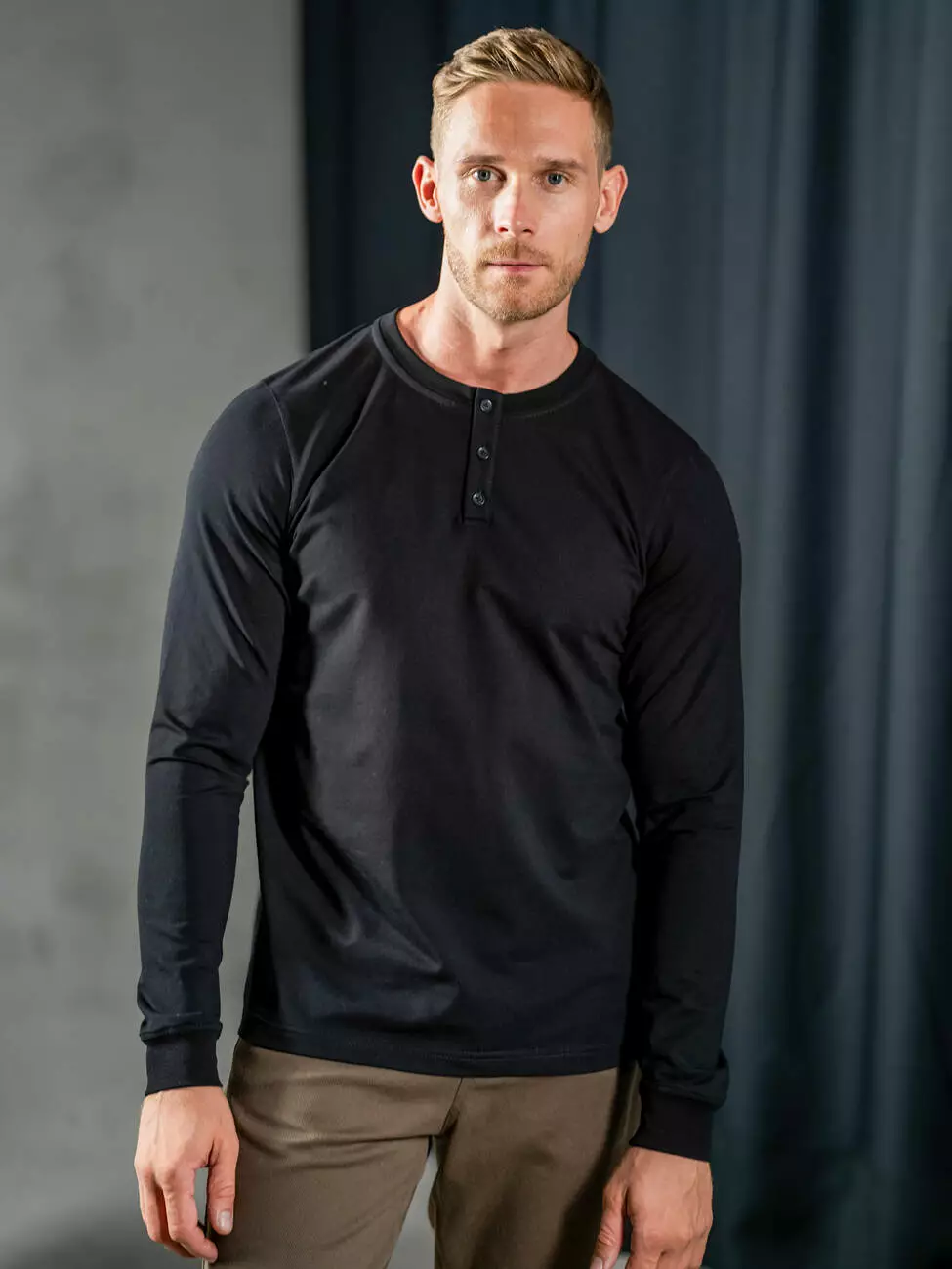 Мужской трикотажный лонгслив с планкой на пуговицах, эластичным
