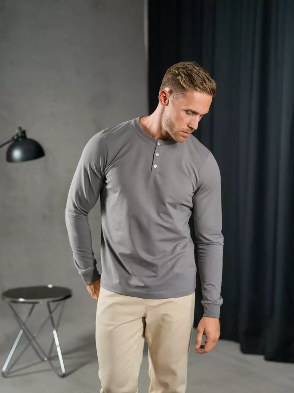 Мужской трикотажный лонгслив с планкой на пуговицах, эластичным