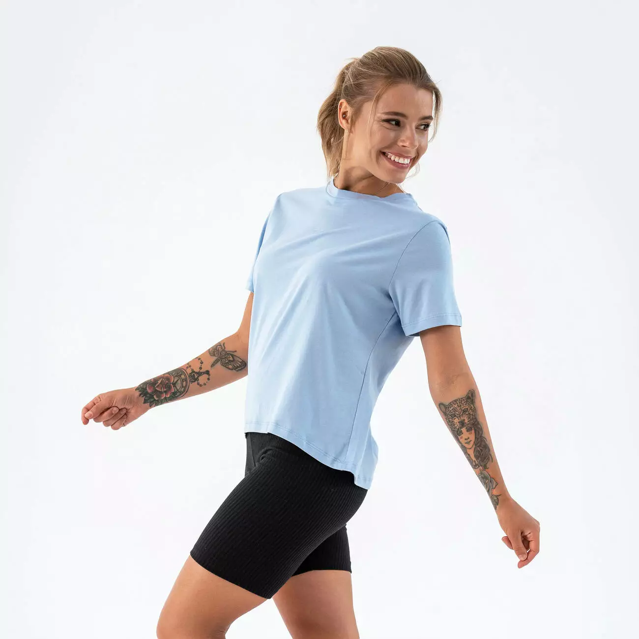 Женская трикотажная базовая футболка, удлиненная сзади.