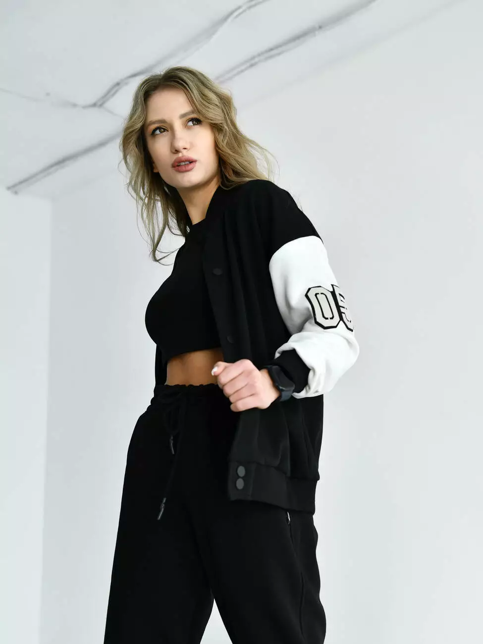 Женская кофта бомбер с контрастными рукавами и брендированными