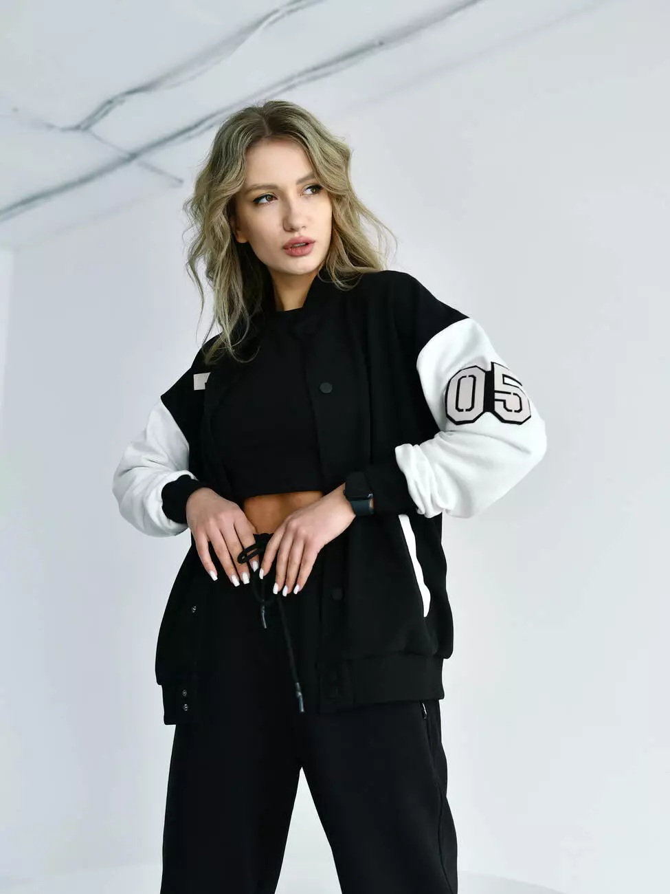 Женская кофта бомбер с контрастными рукавами и брендированными