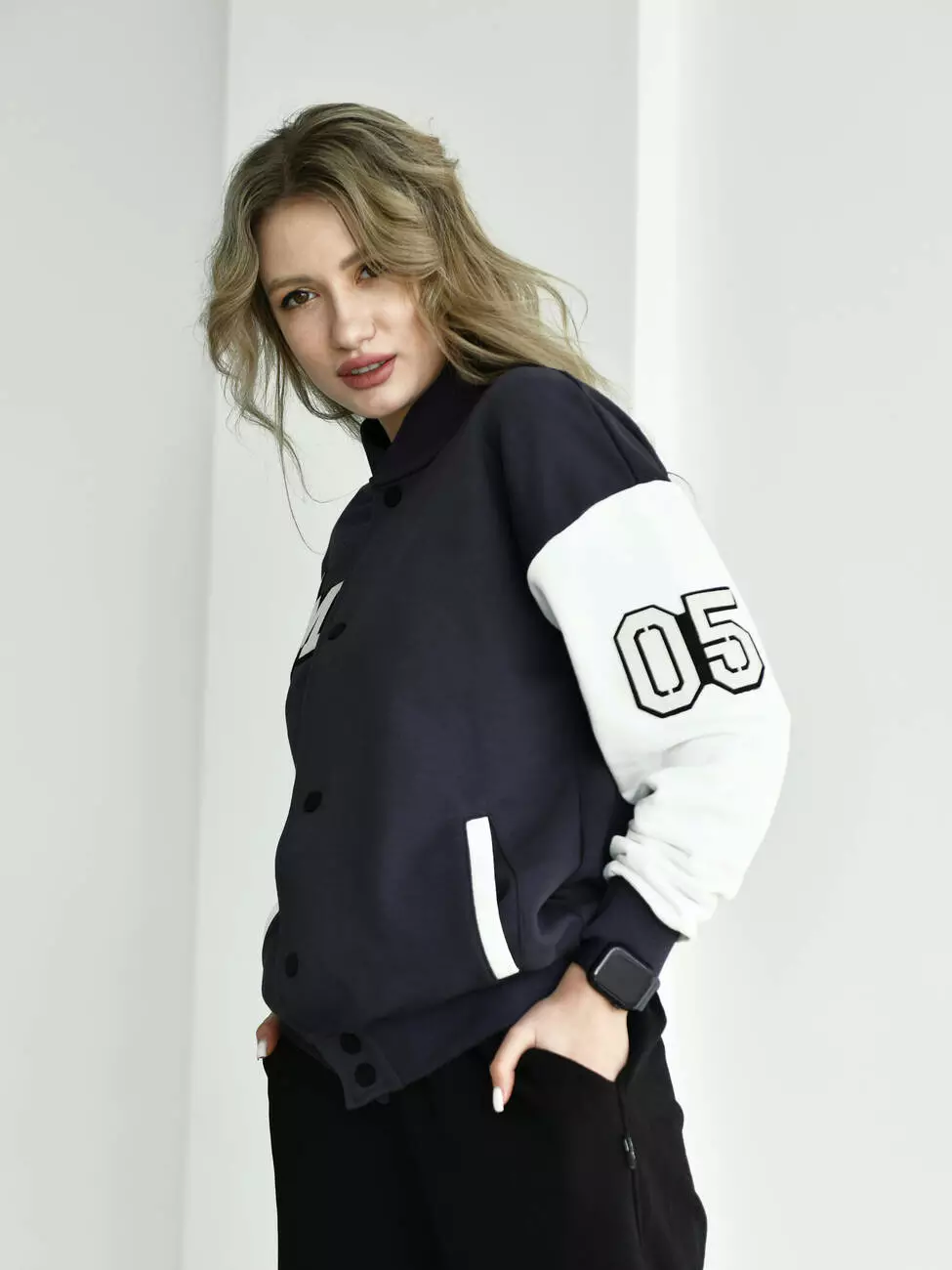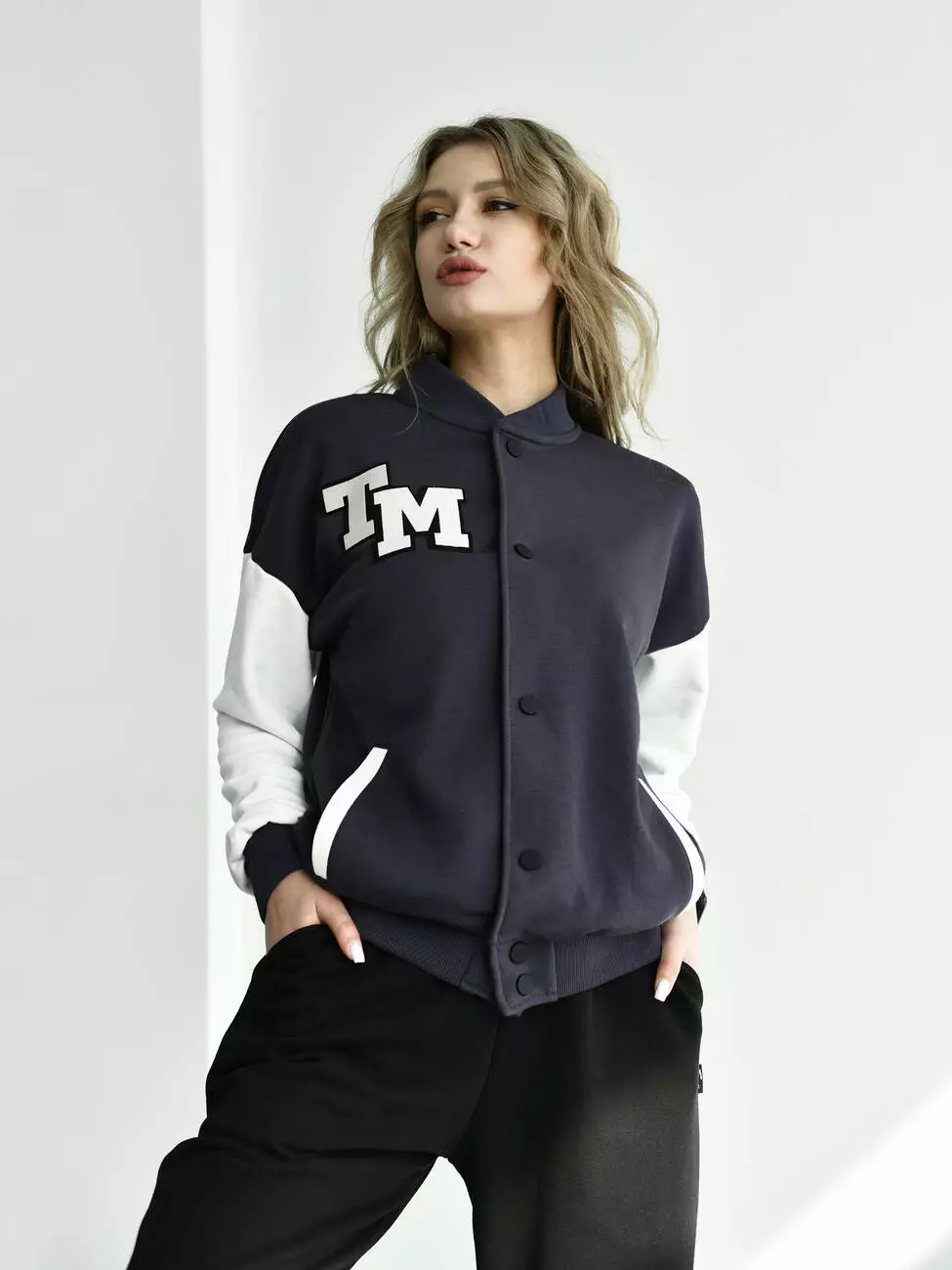 Женская кофта бомбер с контрастными рукавами и брендированными