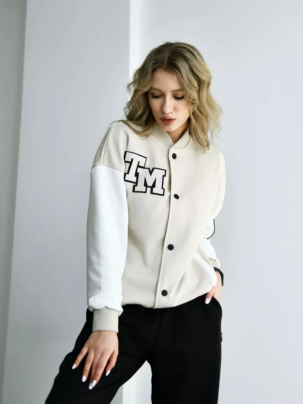 Женская кофта бомбер с контрастными рукавами и брендированными