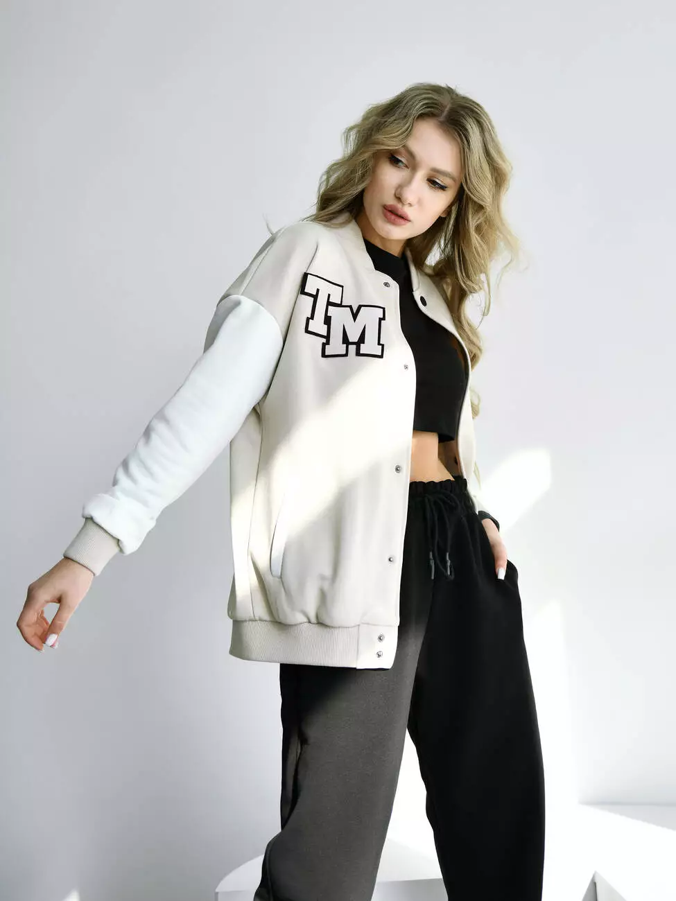Женская кофта бомбер с контрастными рукавами и брендированными