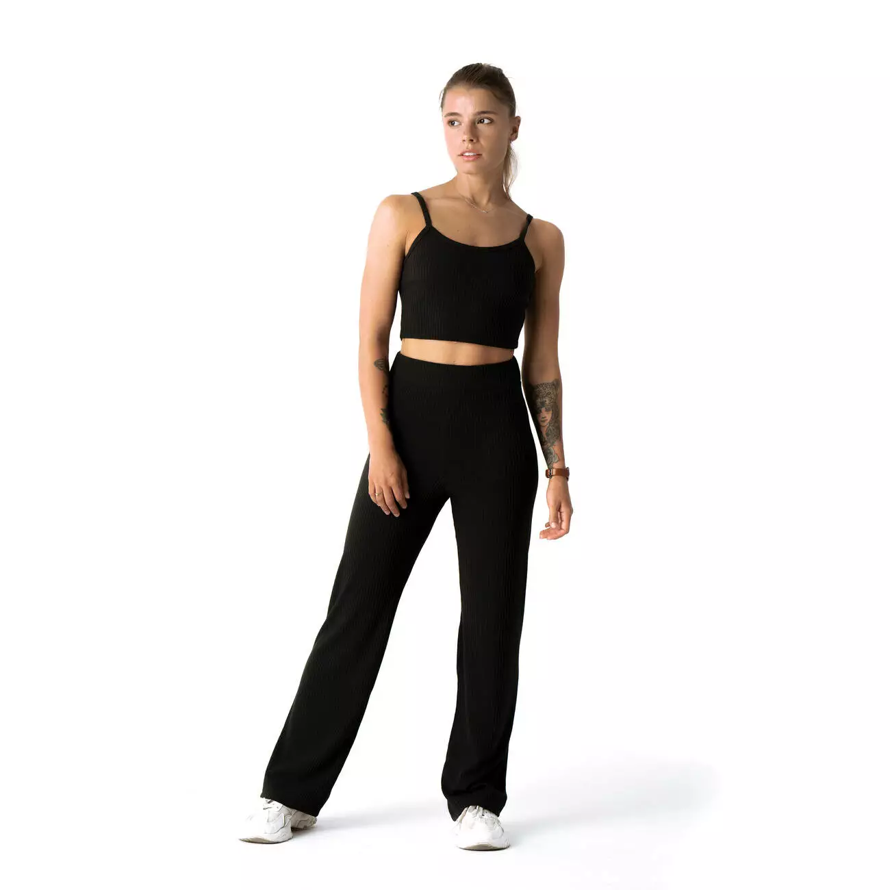 материала. Штаны с высокой посадкой прямого кроя, с эластичным