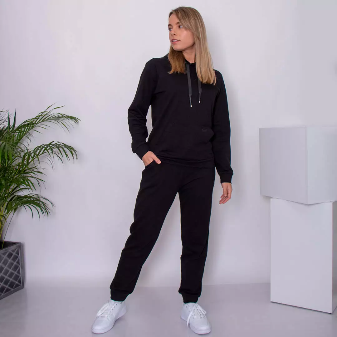 Стильный однотонный костюм из худи с карманом-кенгуру и штанами с
