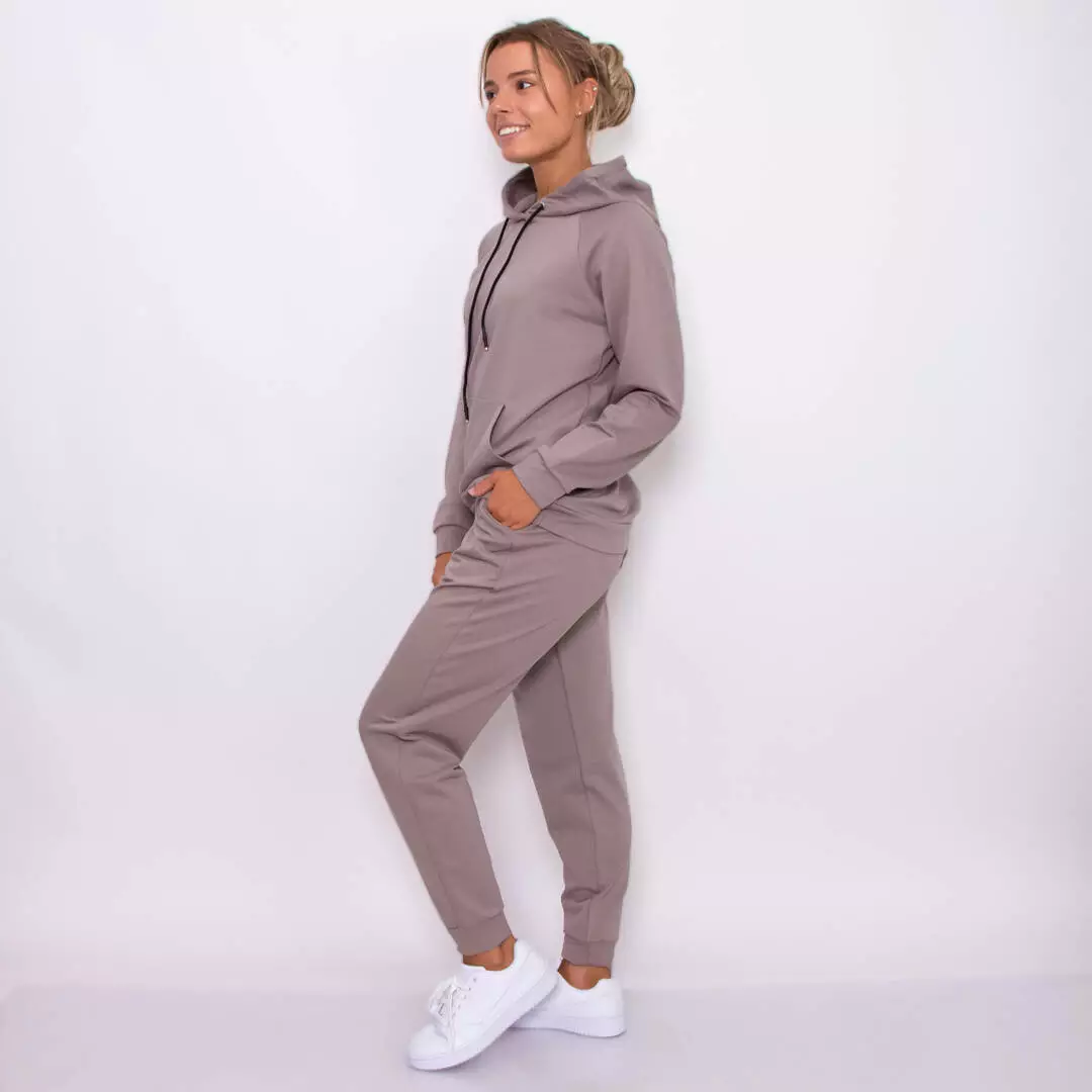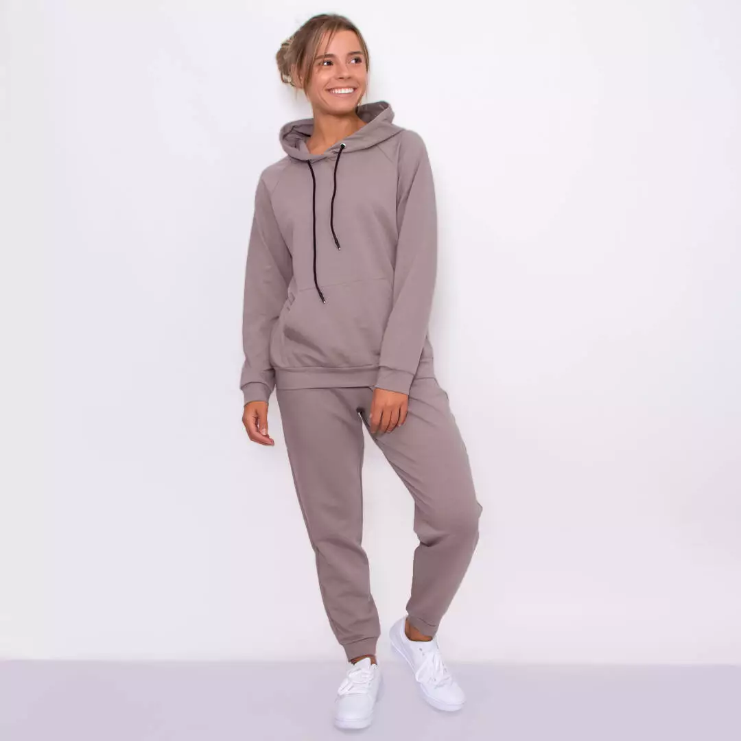 Стильный однотонный костюм из худи с карманом-кенгуру и штанами с