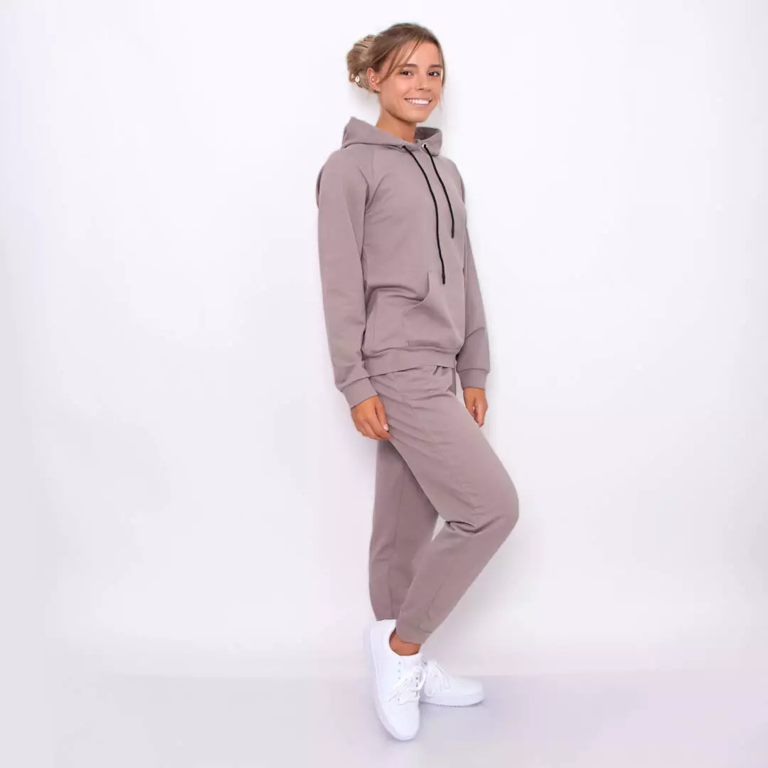 Стильный однотонный костюм из худи с карманом-кенгуру и штанами с