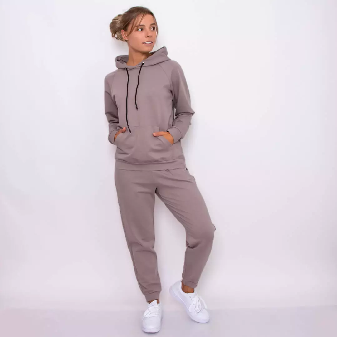 Стильный однотонный костюм из худи с карманом-кенгуру и штанами с