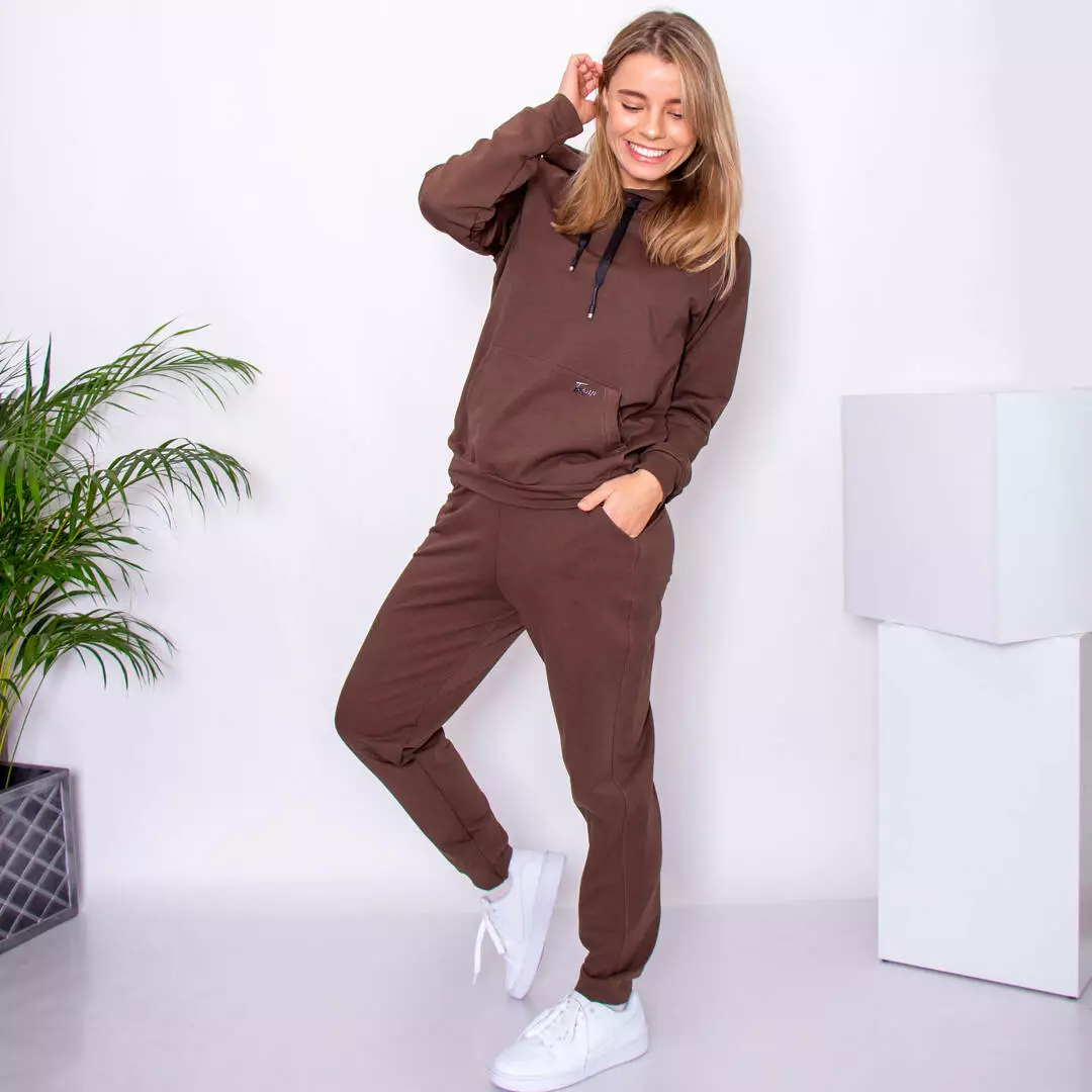 Стильный однотонный костюм из худи с карманом-кенгуру и штанами с