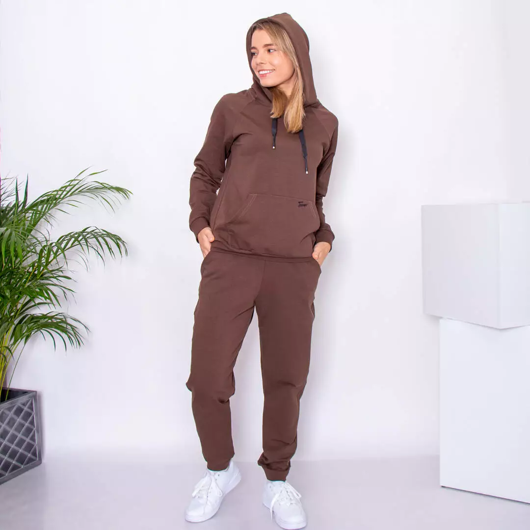 Стильный однотонный костюм из худи с карманом-кенгуру и штанами с