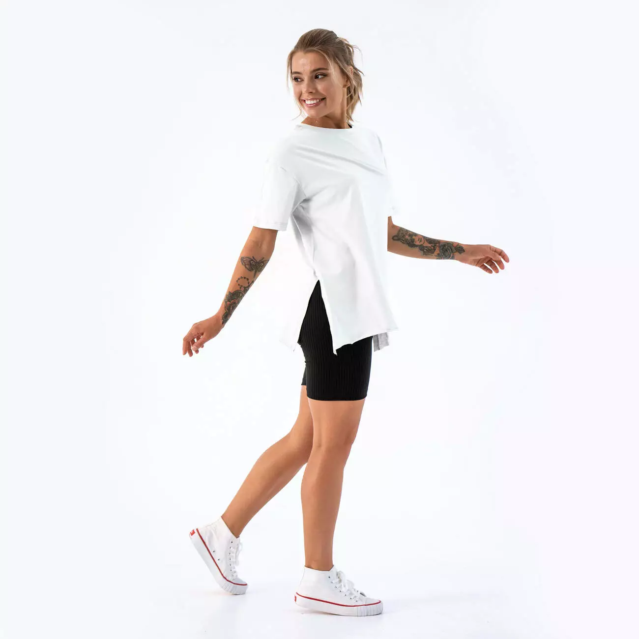 Футболка с боковыми размеразами и необработанным низом. Велосипедки