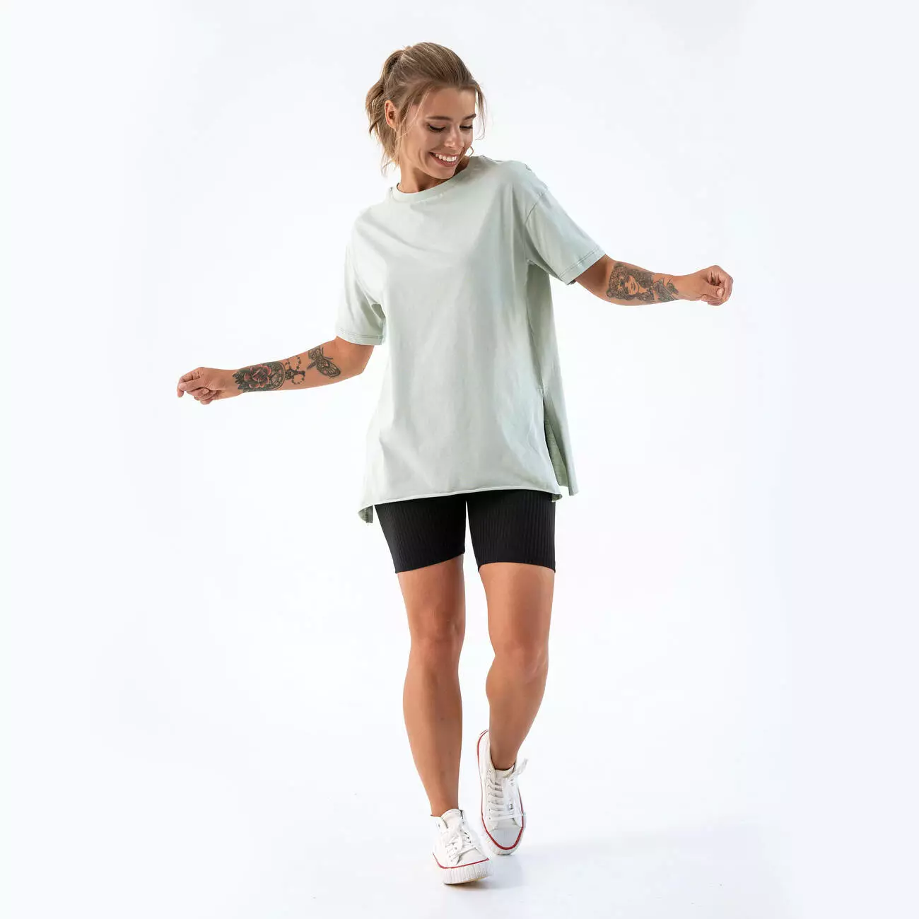 Футболка с боковыми размеразами и необработанным низом. Велосипедки