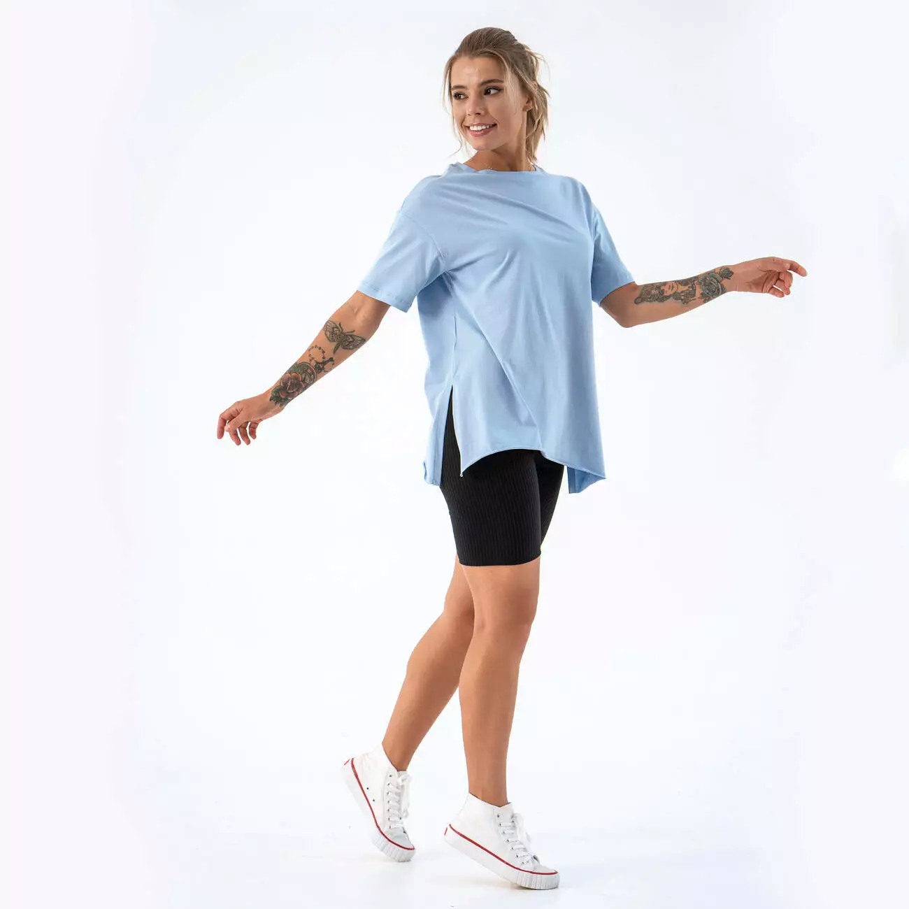 Футболка с боковыми размеразами и необработанным низом. Велосипедки