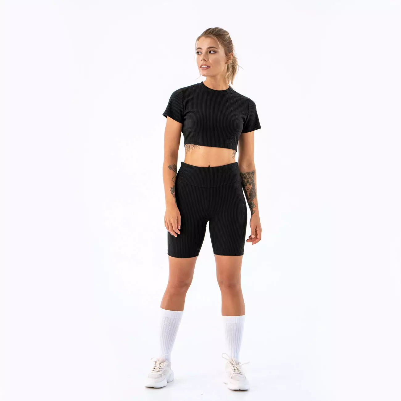 Велосипедки с удобным широким поясом и облегающая футболка-топ.