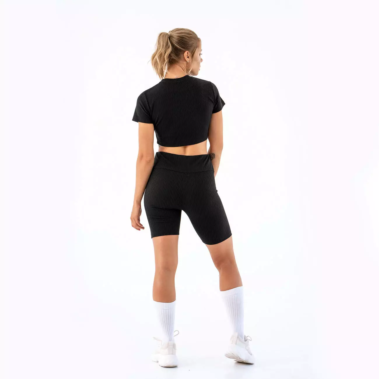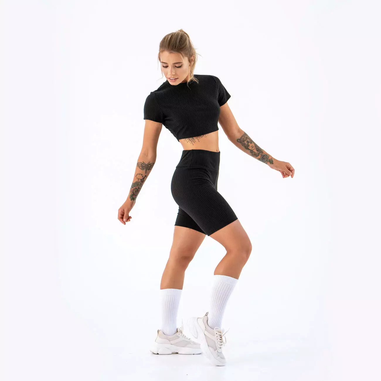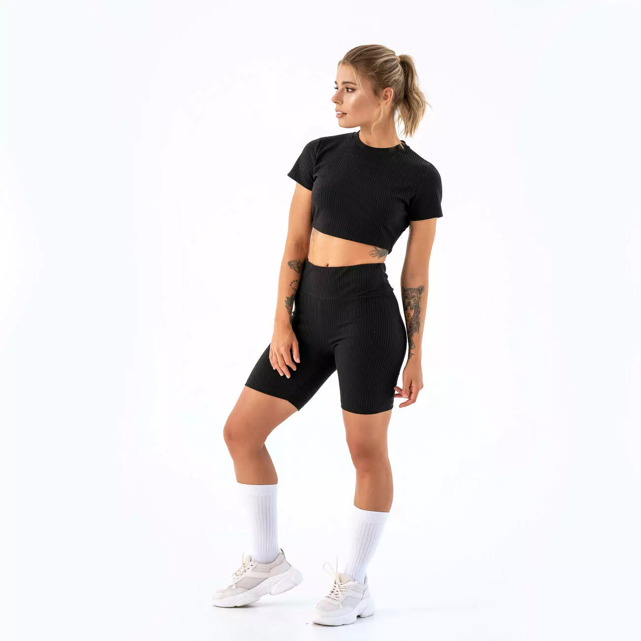 Велосипедки с удобным широким поясом и облегающая футболка-топ.