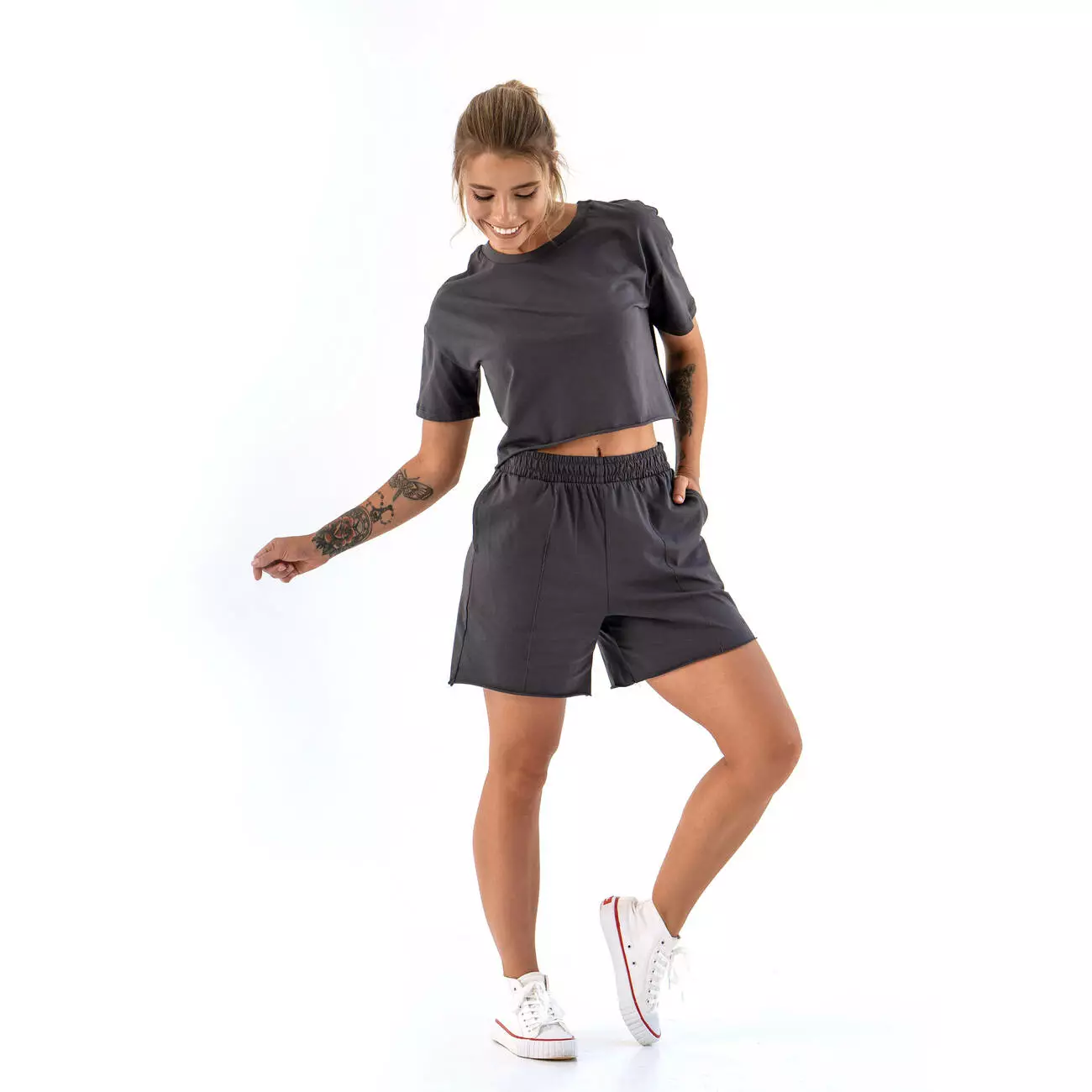 швами спереди шорт. Футболка с необработанным низом в форме