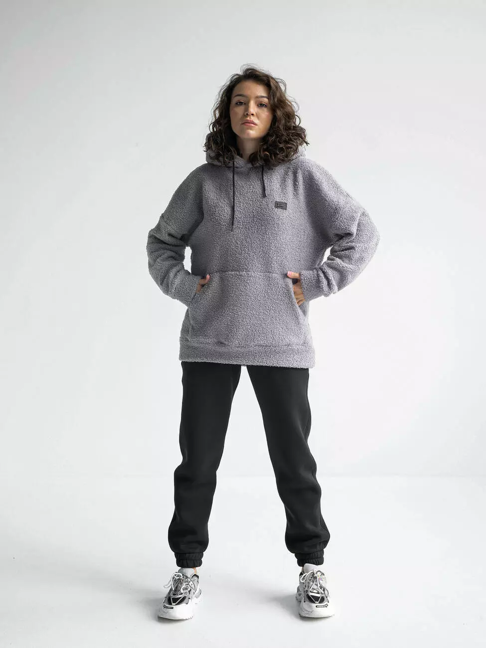 стиле оверсайз, с двойным капюшоном и спущенным плечевым швом.