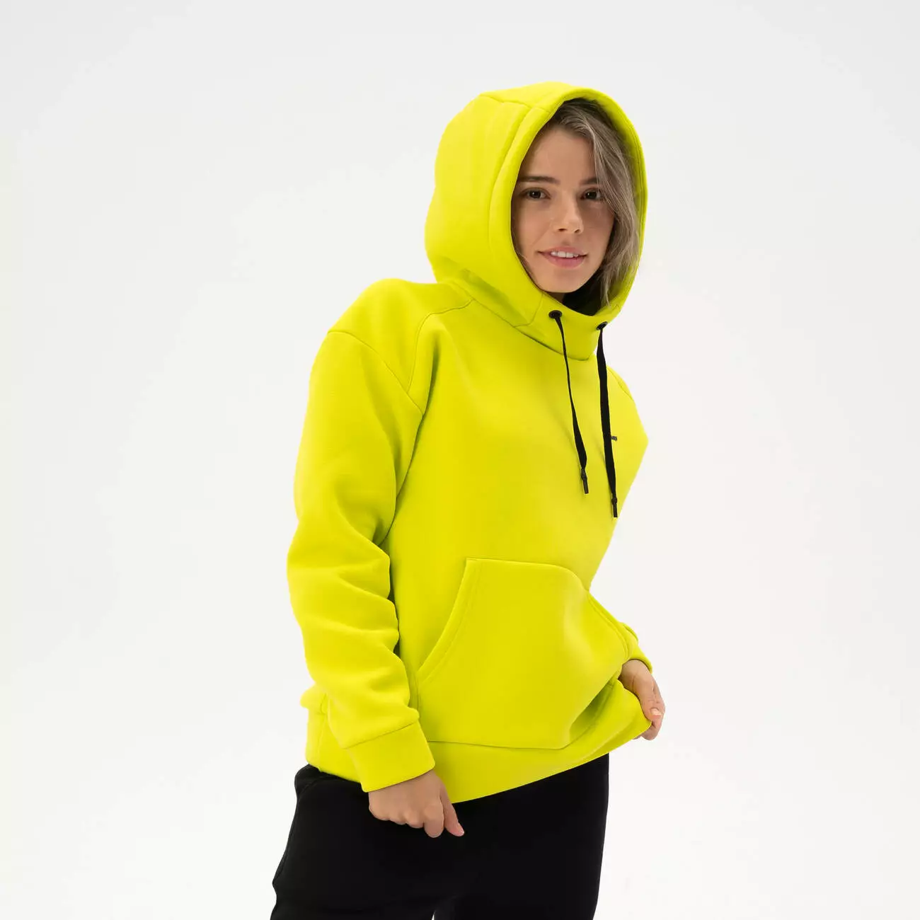 Женский теплый худи свободного кроя с капюшоном со стойкой и карманом-кенгуру.