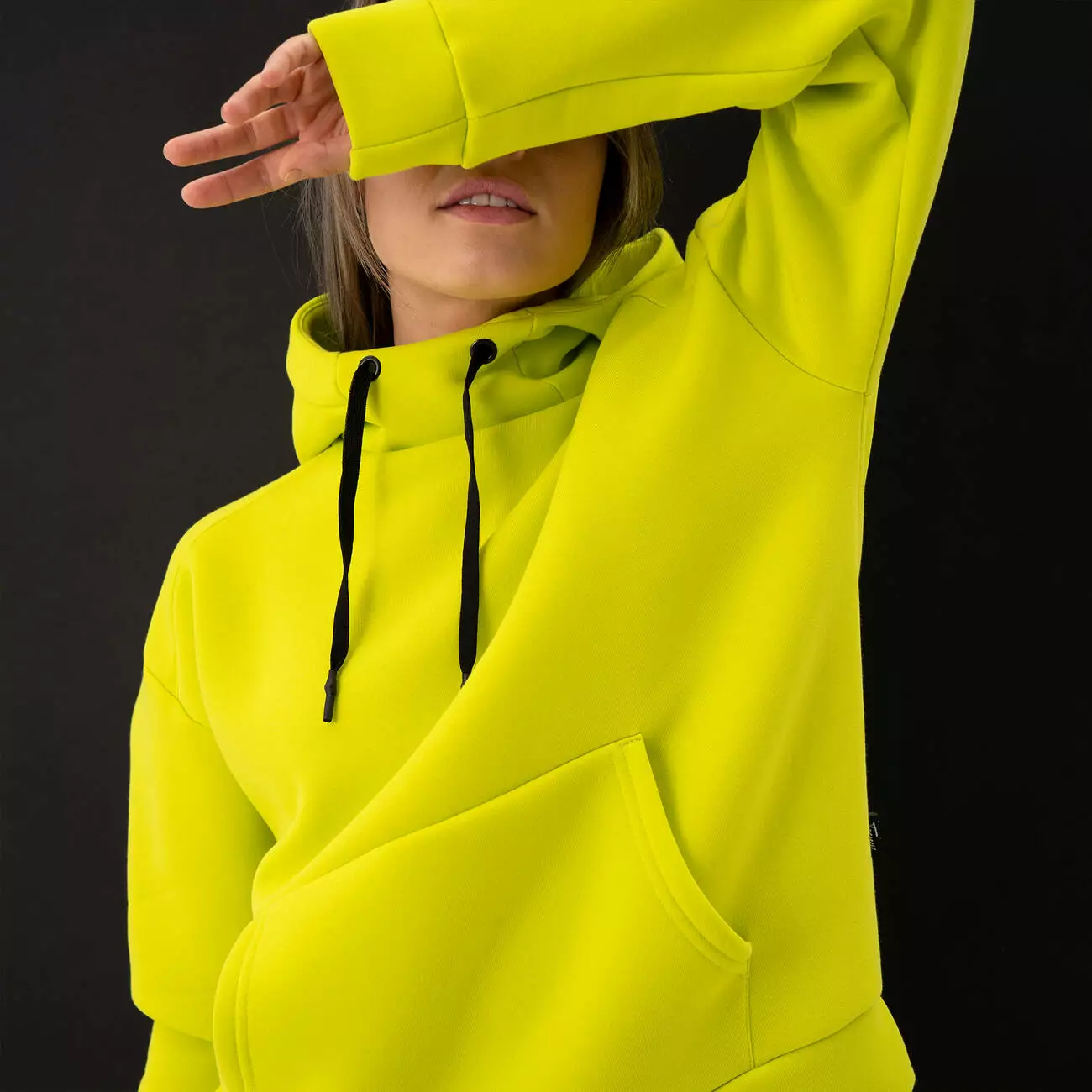 Женский теплый худи свободного кроя с капюшоном со стойкой и карманом-кенгуру.